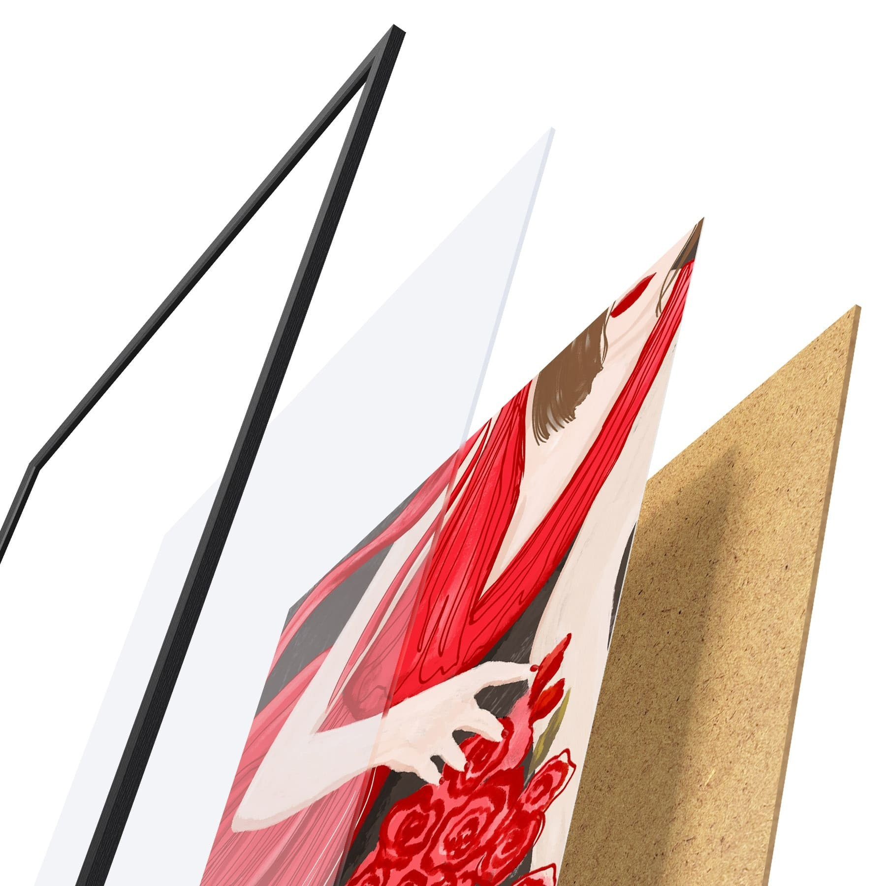 De poster bestaat uit een frame, plexiglas, geprinte afbeelding en spaanplaat achterkant. De poster kan meteen aan de muur worden gehangen dankzij de bevestigingen op de achterkant.