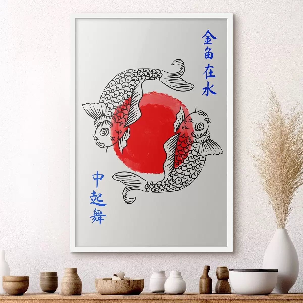 Poster Twee decoratieve vissen rond een rode cirkel f48033