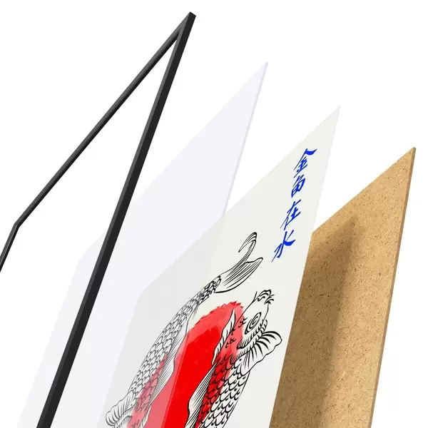 De poster bestaat uit een frame, plexiglas, geprinte afbeelding en spaanplaat achterkant. De poster kan meteen aan de muur worden gehangen dankzij de bevestigingen op de achterkant.