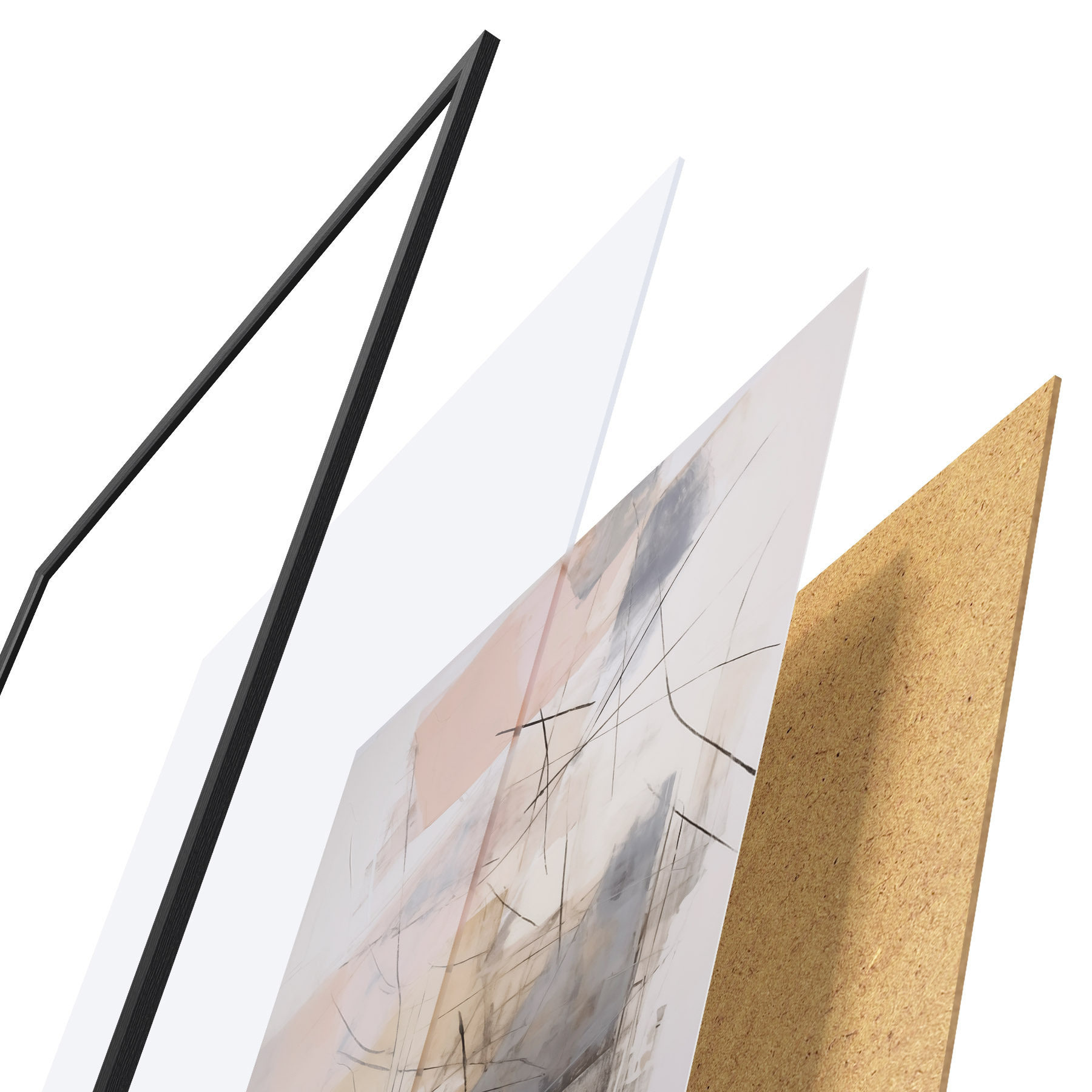 De poster bestaat uit een frame, plexiglas, geprinte afbeelding en spaanplaat achterkant. De poster kan meteen aan de muur worden gehangen dankzij de bevestigingen op de achterkant.