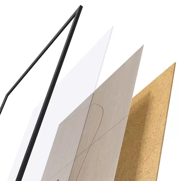 De poster bestaat uit een frame, plexiglas, geprinte afbeelding en spaanplaat achterkant. De poster kan meteen aan de muur worden gehangen dankzij de bevestigingen op de achterkant.