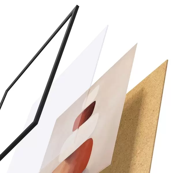De poster bestaat uit een frame, plexiglas, geprinte afbeelding en spaanplaat achterkant. De poster kan meteen aan de muur worden gehangen dankzij de bevestigingen op de achterkant.
