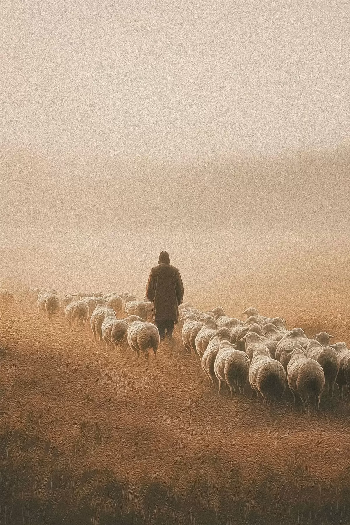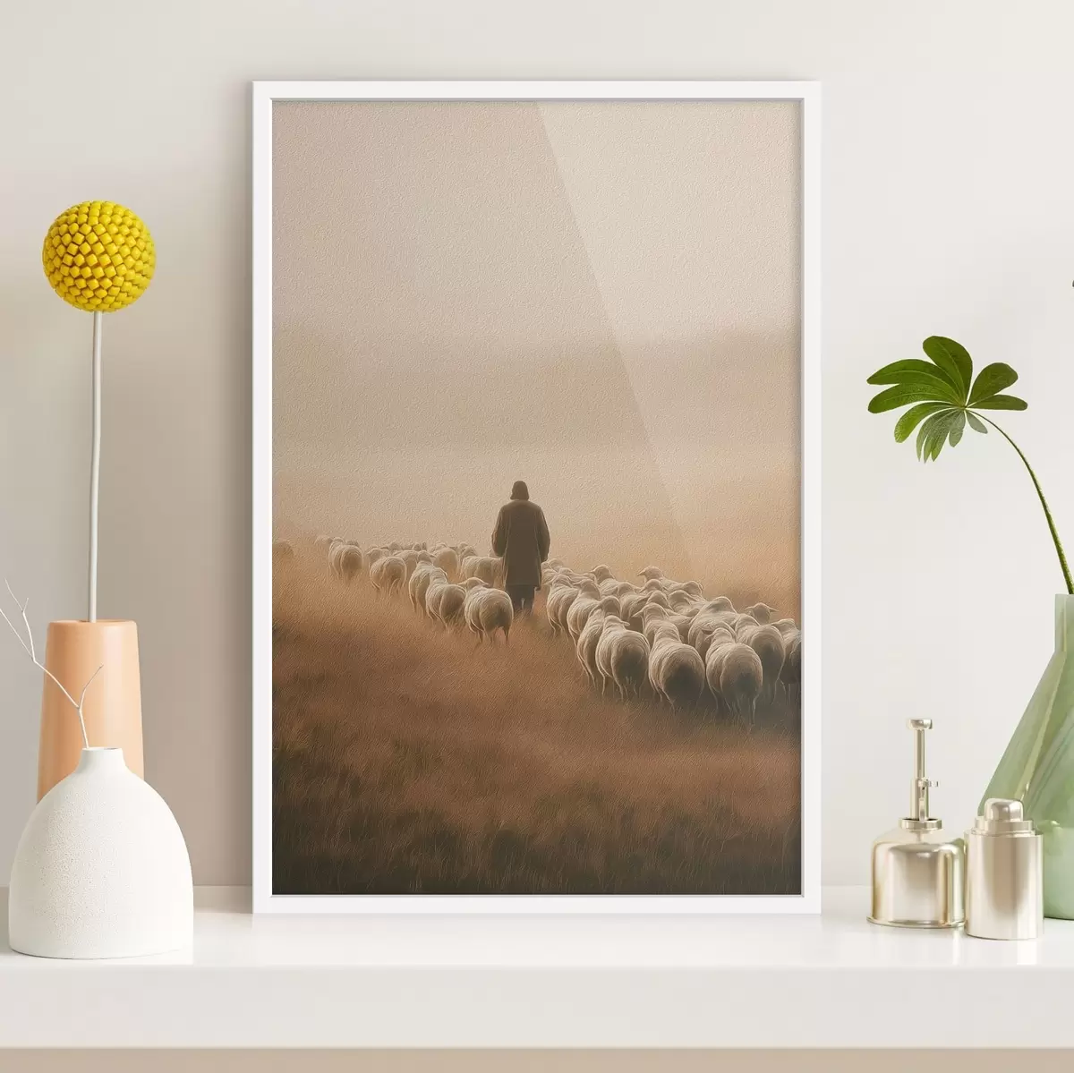 Poster herder die met een kudde schapen in een open veld loopt Nr f48077