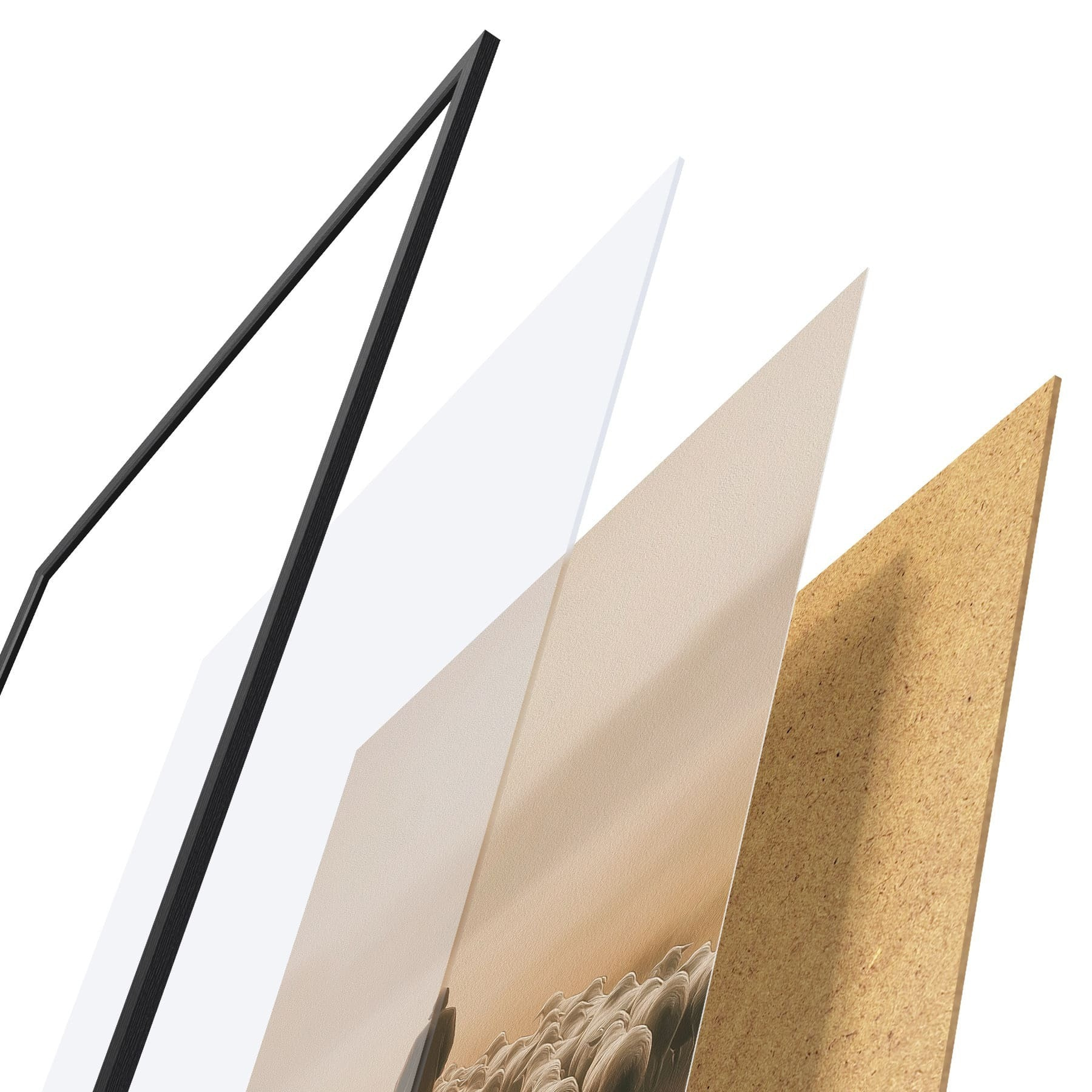 De poster bestaat uit een frame, plexiglas, geprinte afbeelding en spaanplaat achterkant. De poster kan meteen aan de muur worden gehangen dankzij de bevestigingen op de achterkant.