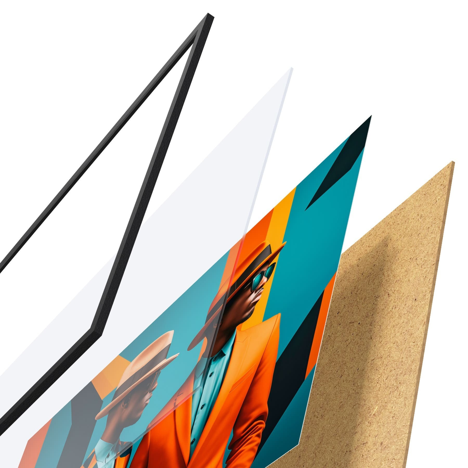 De poster bestaat uit een frame, plexiglas, geprinte afbeelding en spaanplaat achterkant. De poster kan meteen aan de muur worden gehangen dankzij de bevestigingen op de achterkant.