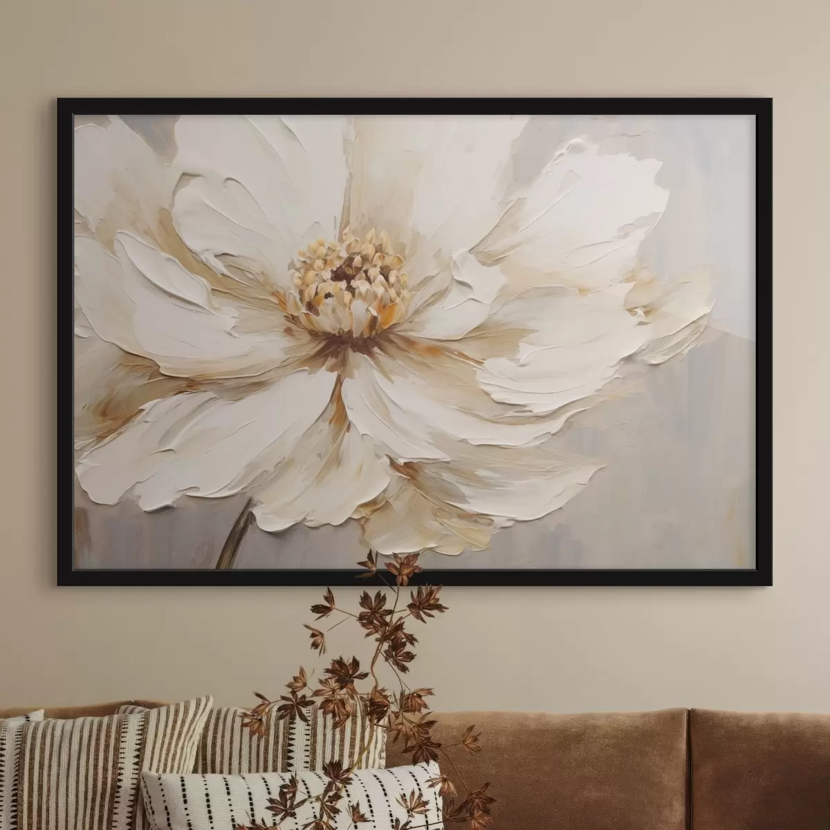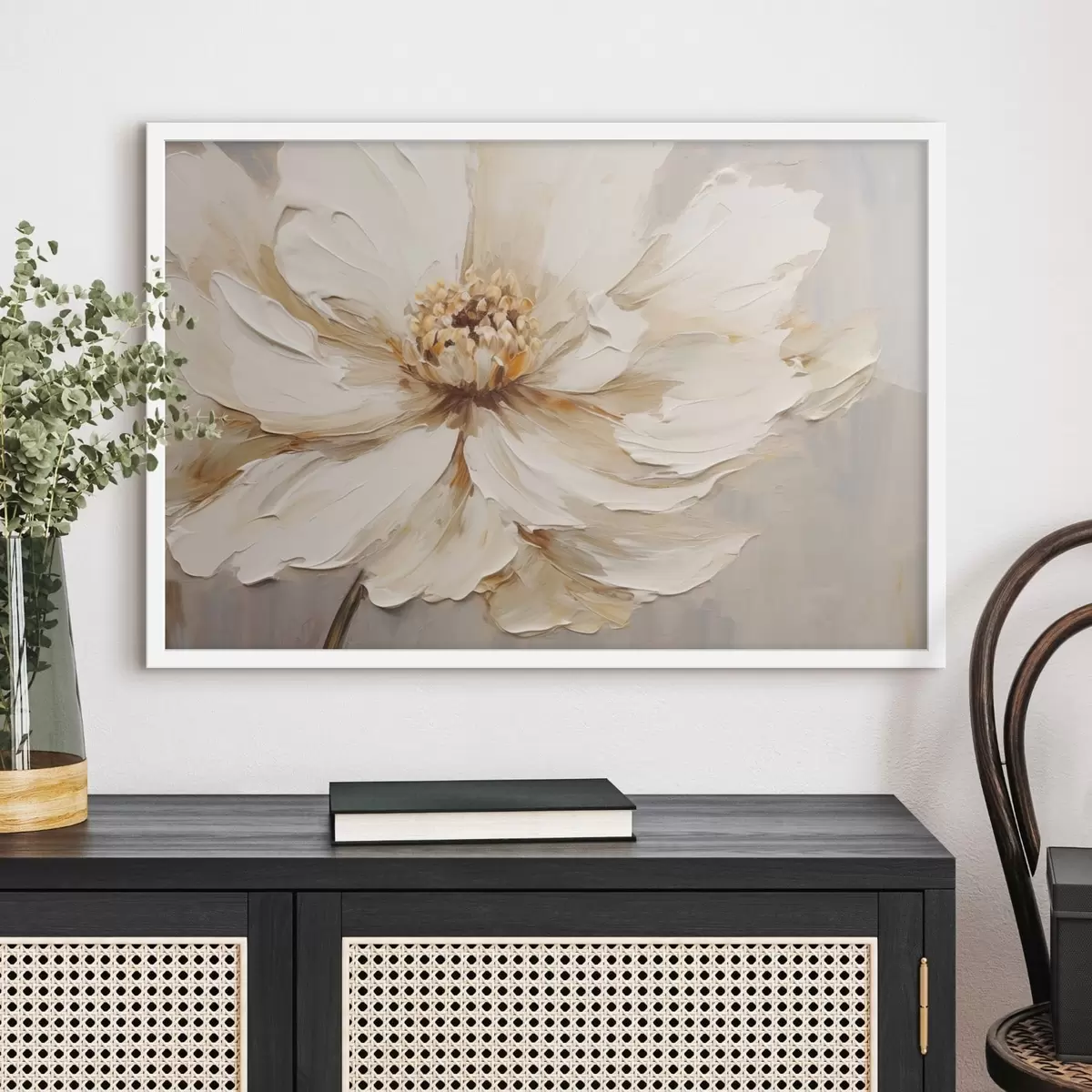 Je kunt het schilderij ophangen aan schroeven. Hiervoor leveren we bevestigingen bij onze foto's, zodat je de foto gemakkelijk kunt ophangen.