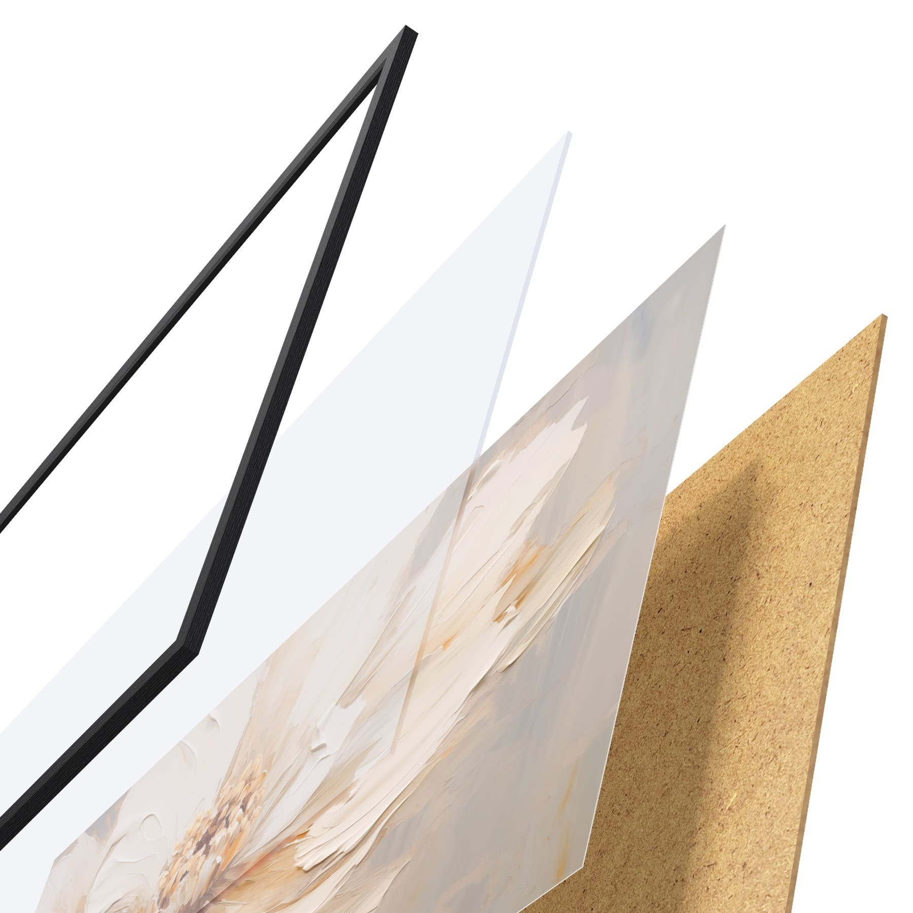 De poster bestaat uit een frame, plexiglas, geprinte afbeelding en spaanplaat achterkant. De poster kan meteen aan de muur worden gehangen dankzij de bevestigingen op de achterkant.