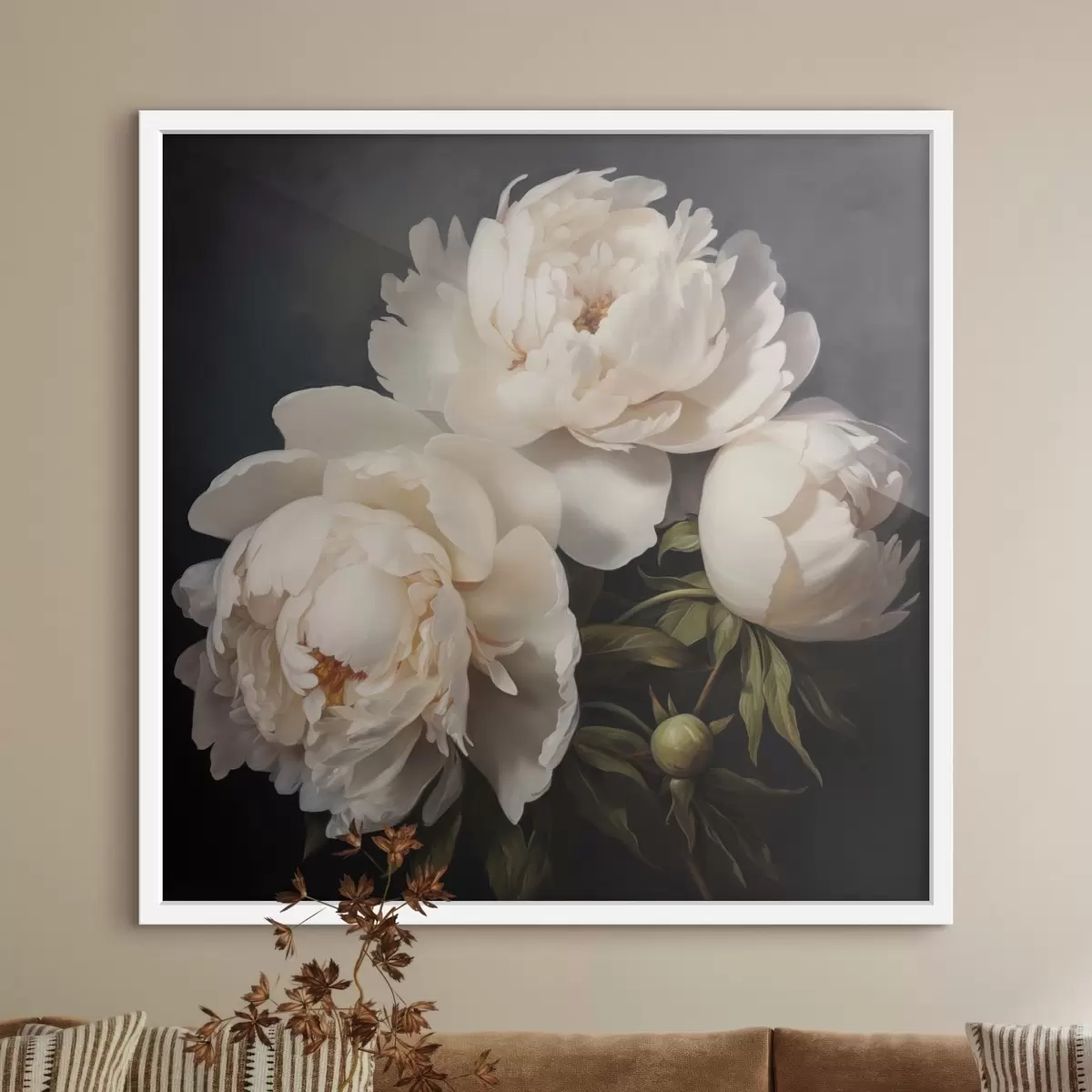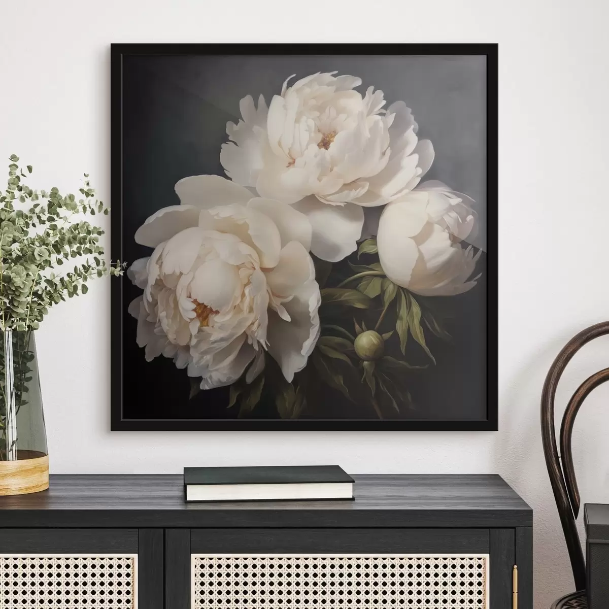 Poster Witte pioenrozen op donkere achtergrond f48101