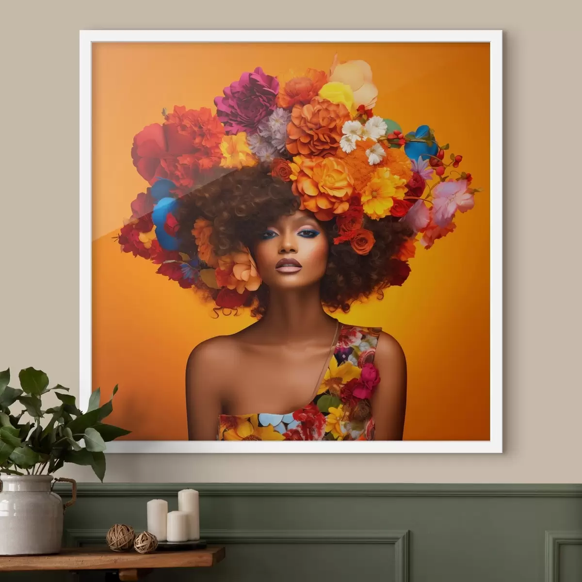 Poster Vrouw met bloemenhoofddeksel op oranje achtergrond f48102