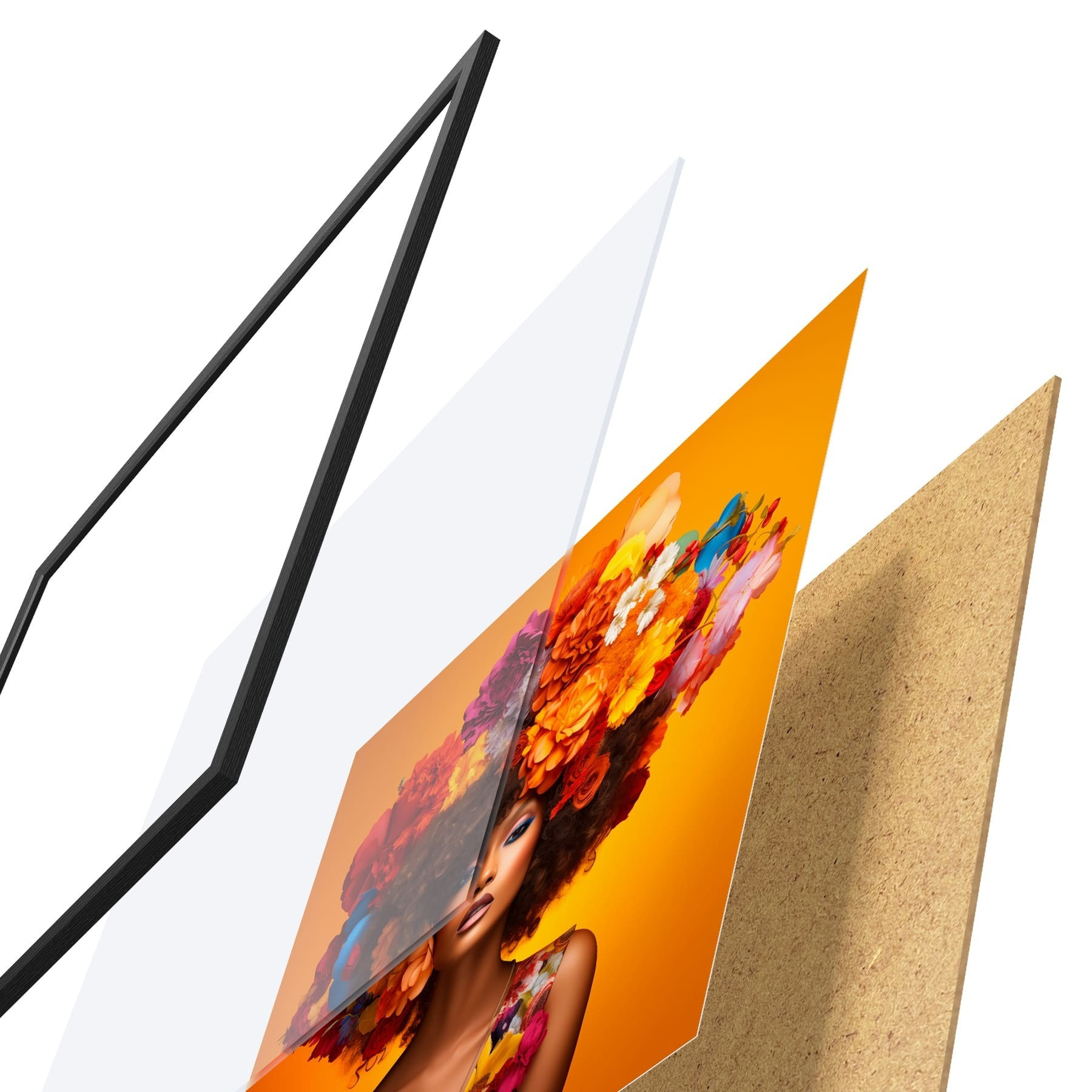 De poster bestaat uit een frame, plexiglas, geprinte afbeelding en spaanplaat achterkant. De poster kan meteen aan de muur worden gehangen dankzij de bevestigingen op de achterkant.