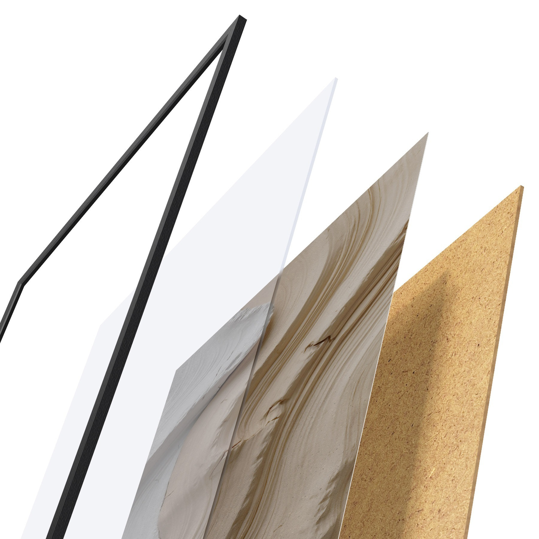 De poster bestaat uit een frame, plexiglas, geprinte afbeelding en spaanplaat achterkant. De poster kan meteen aan de muur worden gehangen dankzij de bevestigingen op de achterkant.