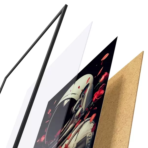 De poster bestaat uit een frame, plexiglas, geprinte afbeelding en spaanplaat achterkant. De poster kan meteen aan de muur worden gehangen dankzij de bevestigingen op de achterkant.