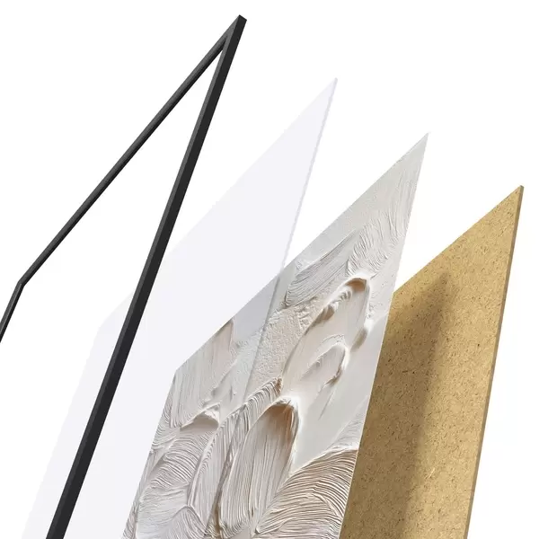 De poster bestaat uit een frame, plexiglas, geprinte afbeelding en spaanplaat achterkant. De poster kan meteen aan de muur worden gehangen dankzij de bevestigingen op de achterkant.