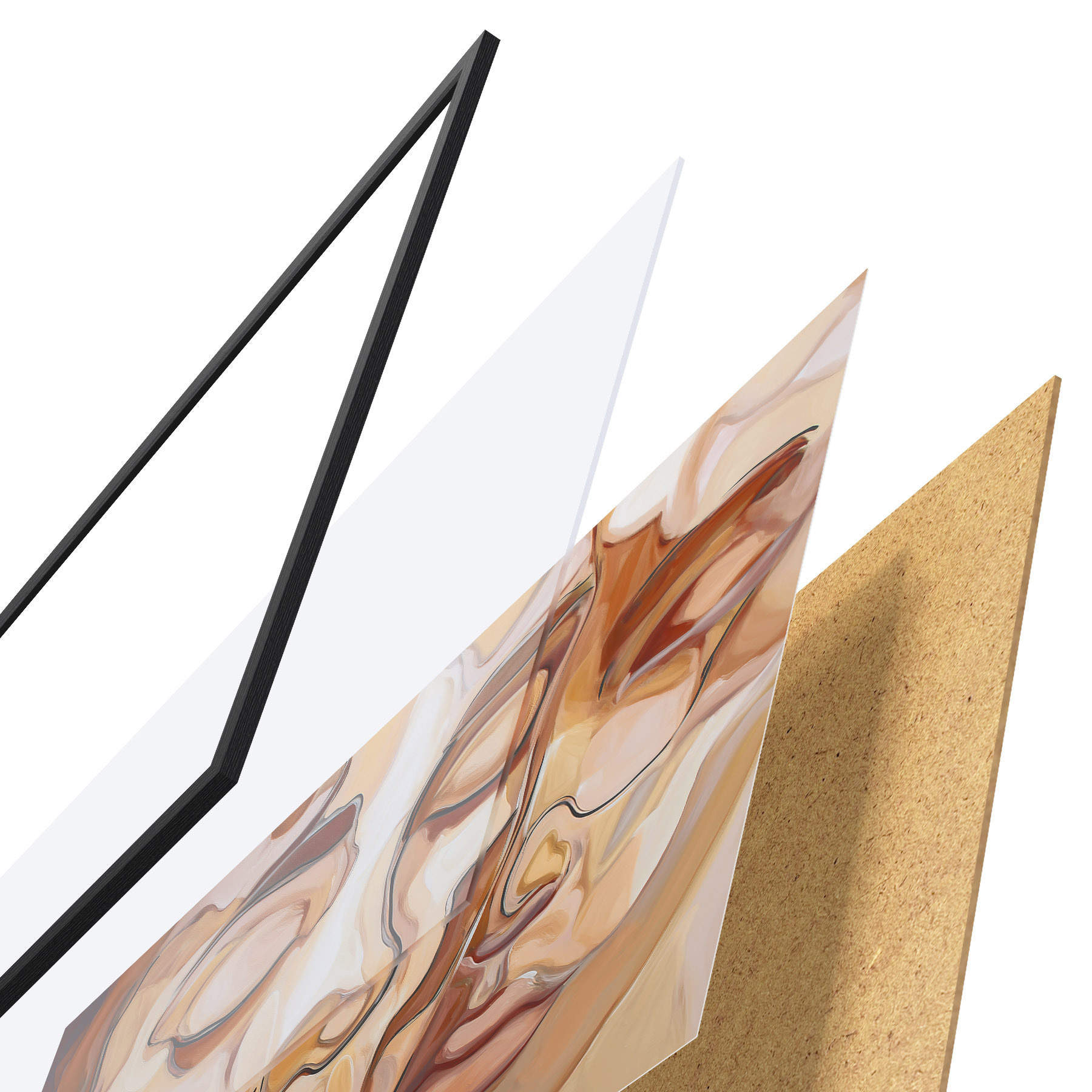 De poster bestaat uit een frame, plexiglas, geprinte afbeelding en spaanplaat achterkant. De poster kan meteen aan de muur worden gehangen dankzij de bevestigingen op de achterkant.
