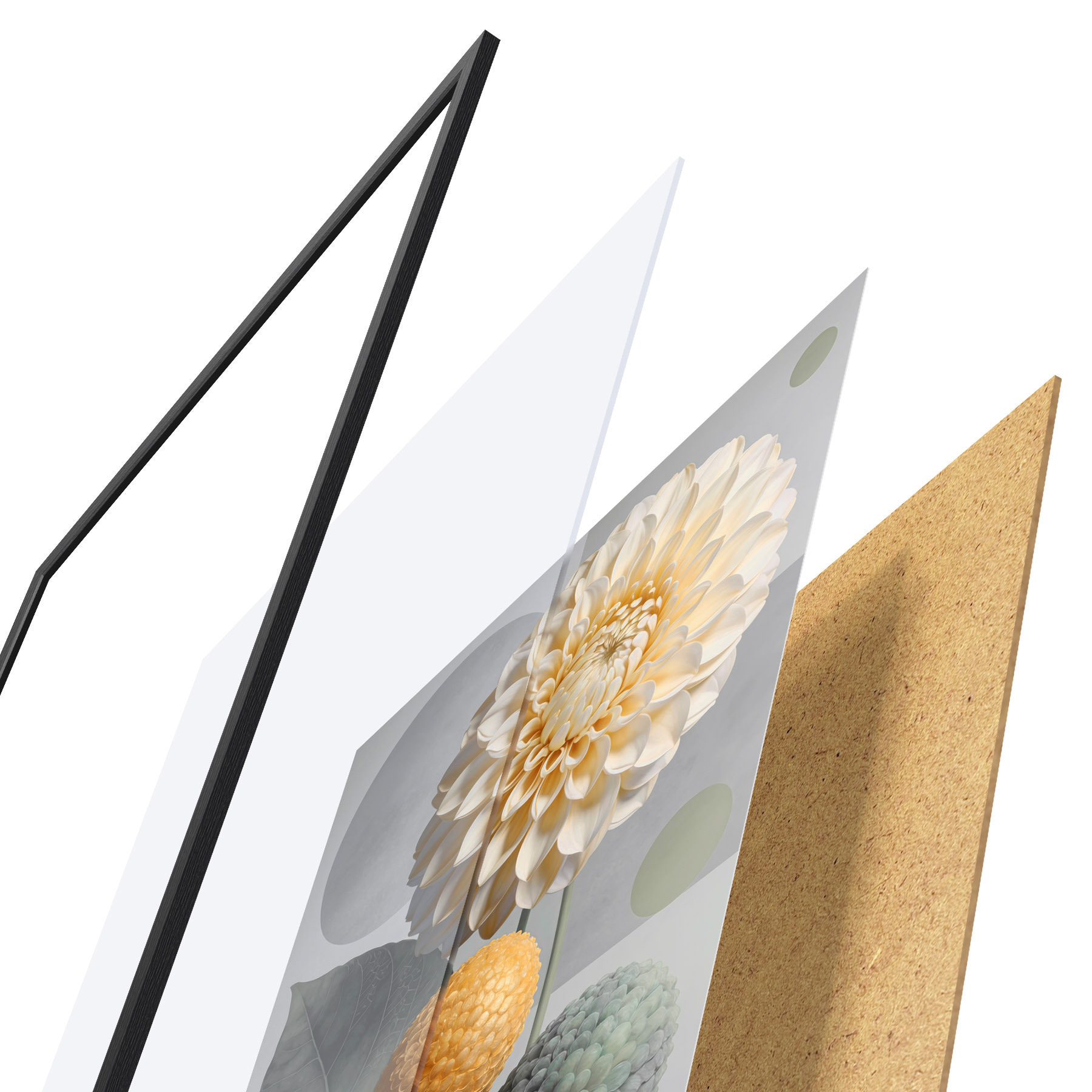 De poster bestaat uit een frame, plexiglas, geprinte afbeelding en spaanplaat achterkant. De poster kan meteen aan de muur worden gehangen dankzij de bevestigingen op de achterkant.