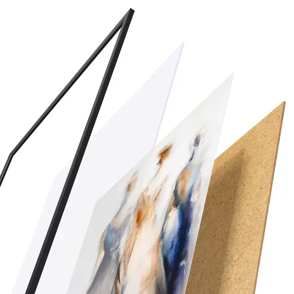 De poster bestaat uit een frame, plexiglas, geprinte afbeelding en spaanplaat achterkant. De poster kan meteen aan de muur worden gehangen dankzij de bevestigingen op de achterkant.