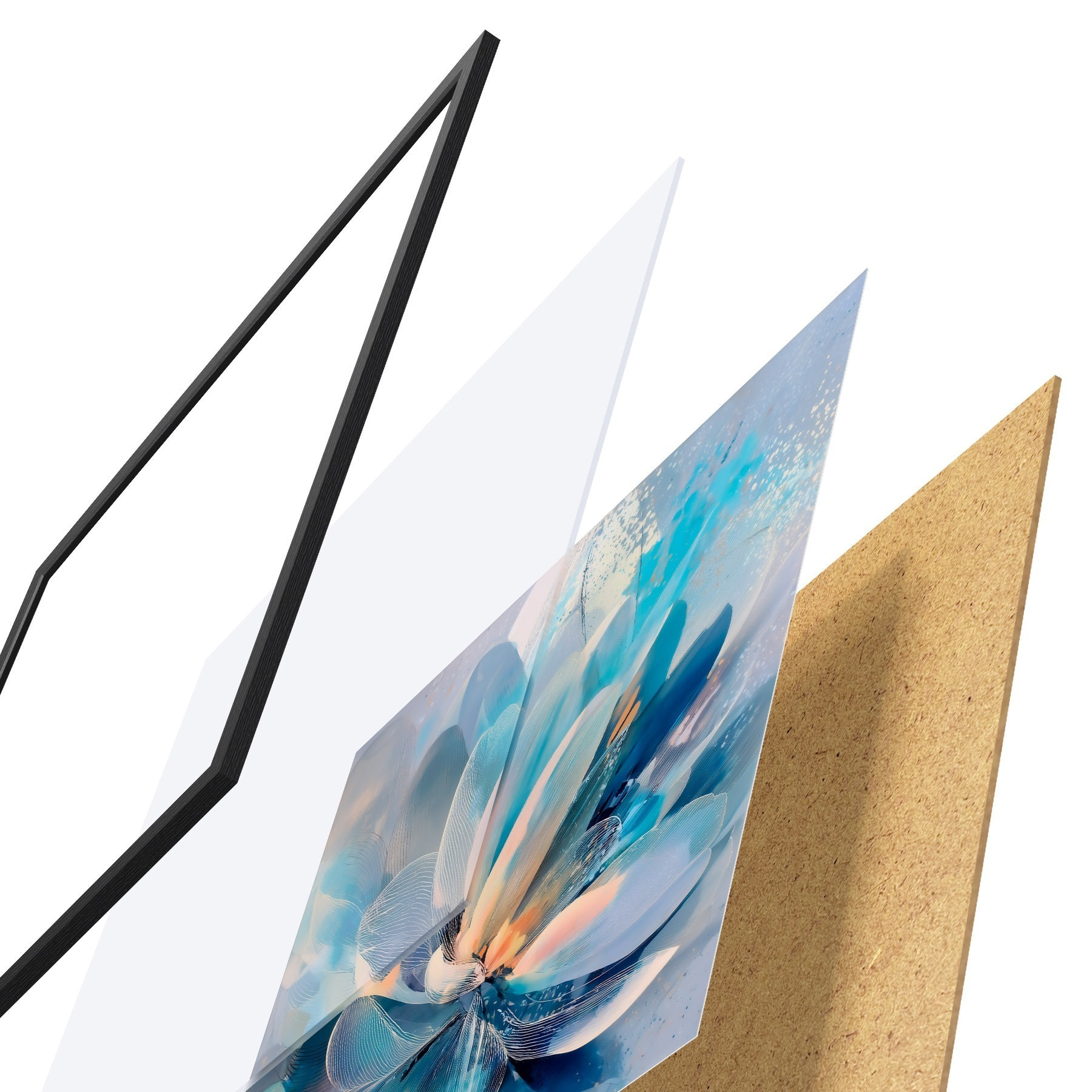 De poster bestaat uit een frame, plexiglas, geprinte afbeelding en spaanplaat achterkant. De poster kan meteen aan de muur worden gehangen dankzij de bevestigingen op de achterkant.