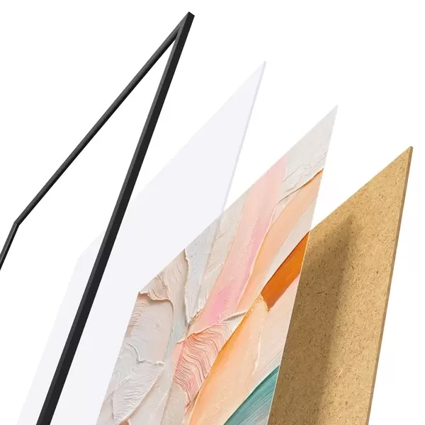 De poster bestaat uit een frame, plexiglas, geprinte afbeelding en spaanplaat achterkant. De poster kan meteen aan de muur worden gehangen dankzij de bevestigingen op de achterkant.