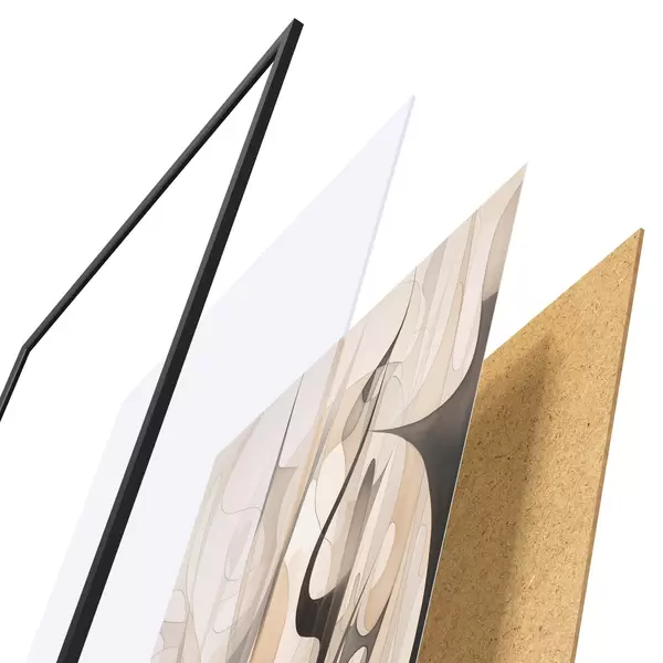 De poster bestaat uit een frame, plexiglas, geprinte afbeelding en spaanplaat achterkant. De poster kan meteen aan de muur worden gehangen dankzij de bevestigingen op de achterkant.