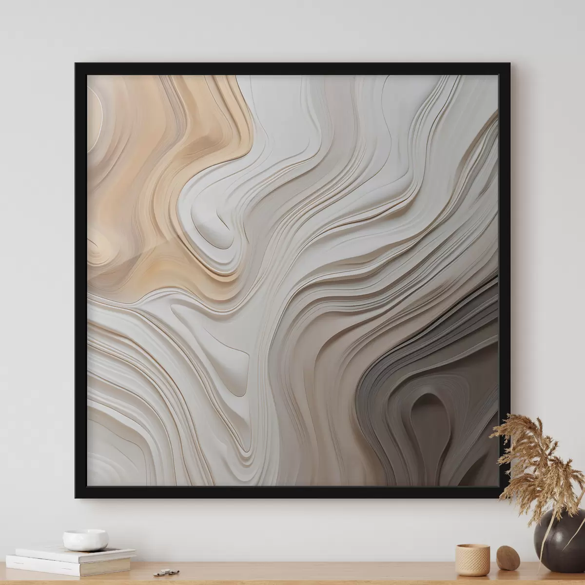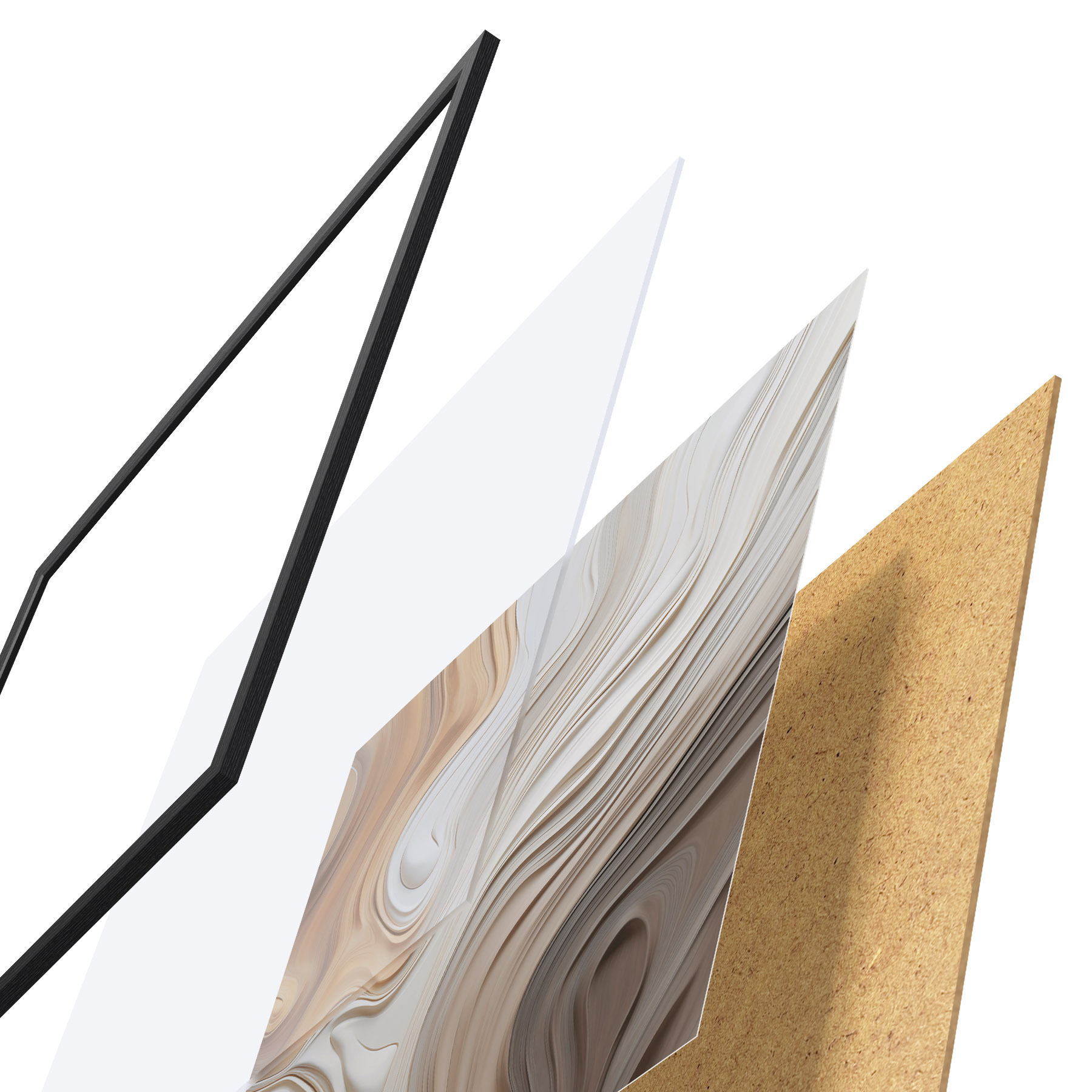 De poster bestaat uit een frame, plexiglas, geprinte afbeelding en spaanplaat achterkant. De poster kan meteen aan de muur worden gehangen dankzij de bevestigingen op de achterkant.
