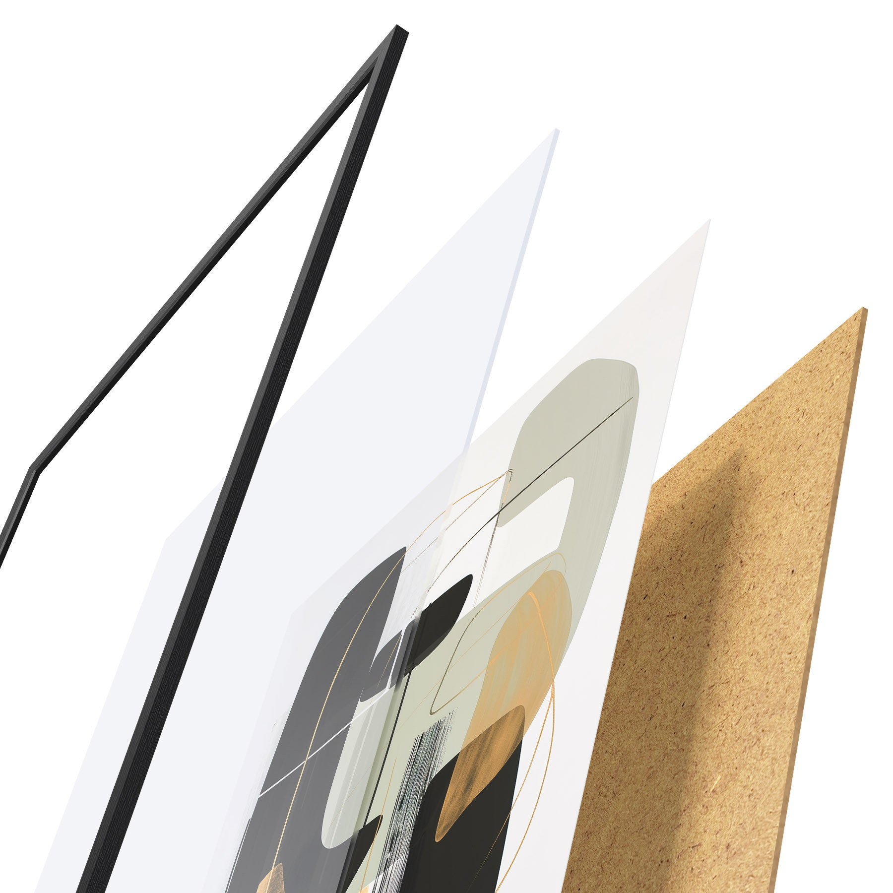 De poster bestaat uit een frame, plexiglas, geprinte afbeelding en spaanplaat achterkant. De poster kan meteen aan de muur worden gehangen dankzij de bevestigingen op de achterkant.