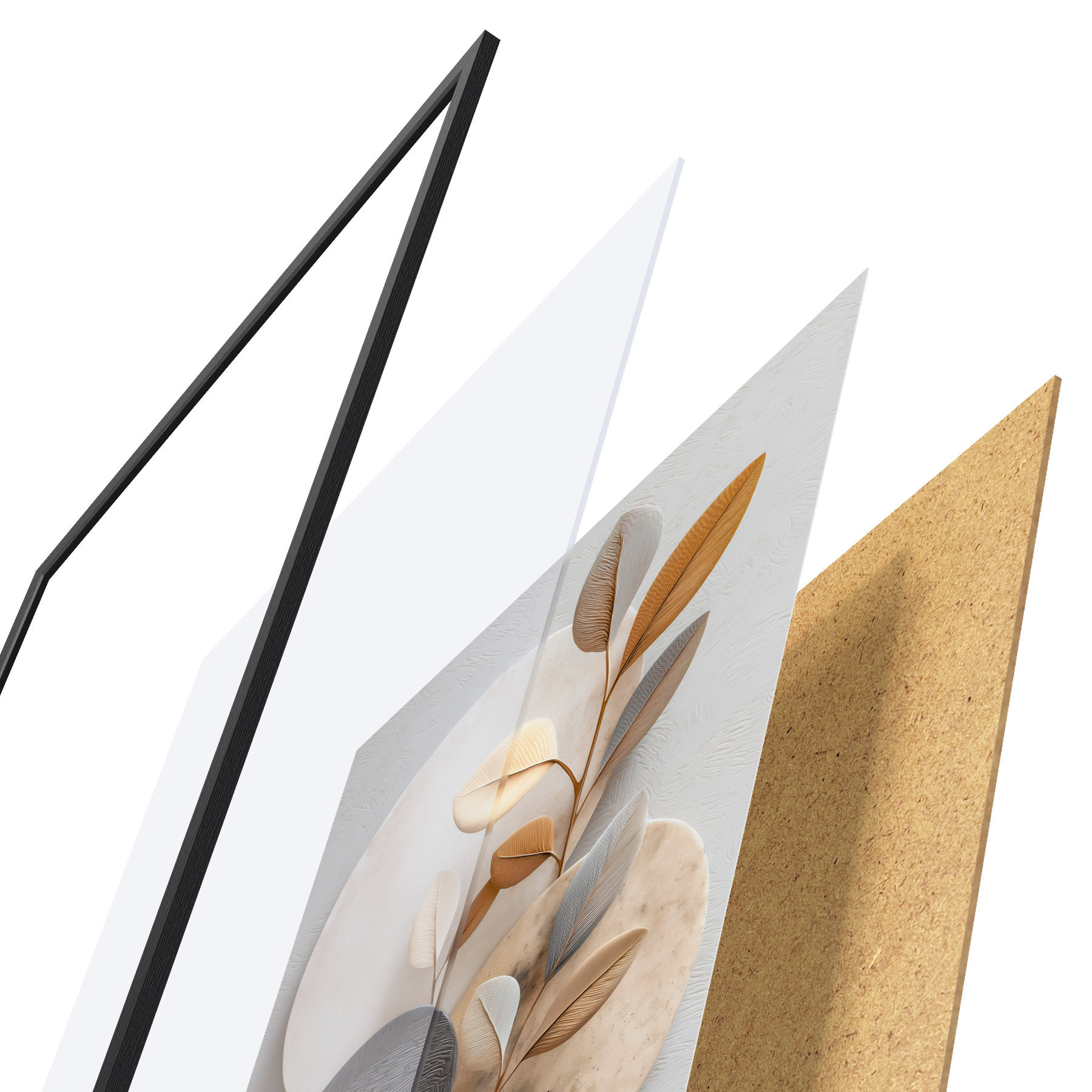 De poster bestaat uit een frame, plexiglas, geprinte afbeelding en spaanplaat achterkant. De poster kan meteen aan de muur worden gehangen dankzij de bevestigingen op de achterkant.
