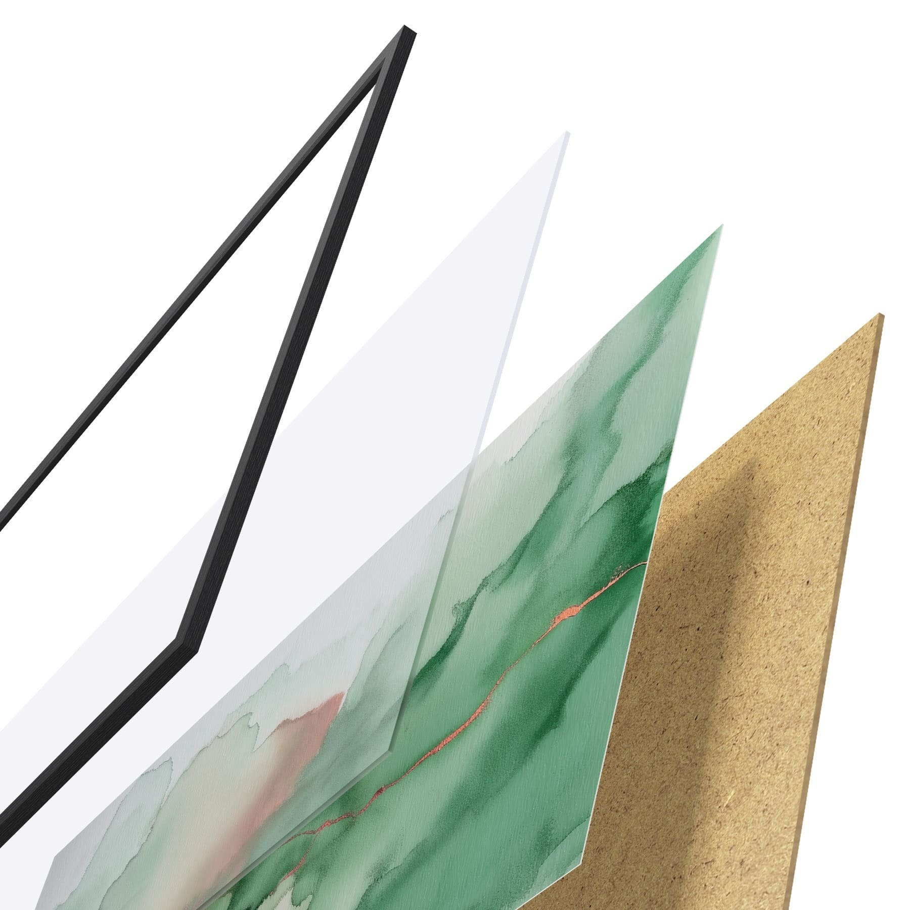 De poster bestaat uit een frame, plexiglas, geprinte afbeelding en spaanplaat achterkant. De poster kan meteen aan de muur worden gehangen dankzij de bevestigingen op de achterkant.