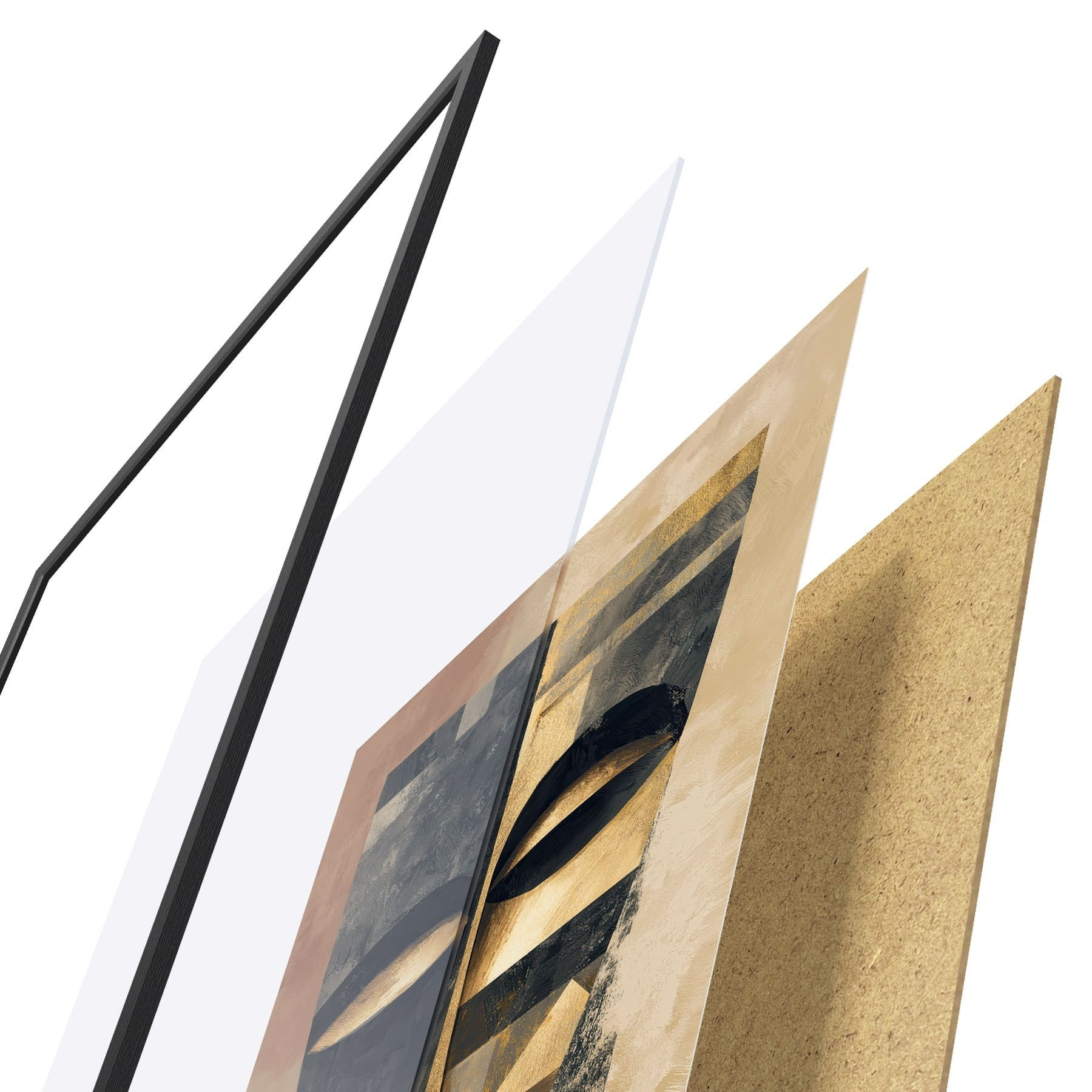 De poster bestaat uit een frame, plexiglas, geprinte afbeelding en spaanplaat achterkant. De poster kan meteen aan de muur worden gehangen dankzij de bevestigingen op de achterkant.
