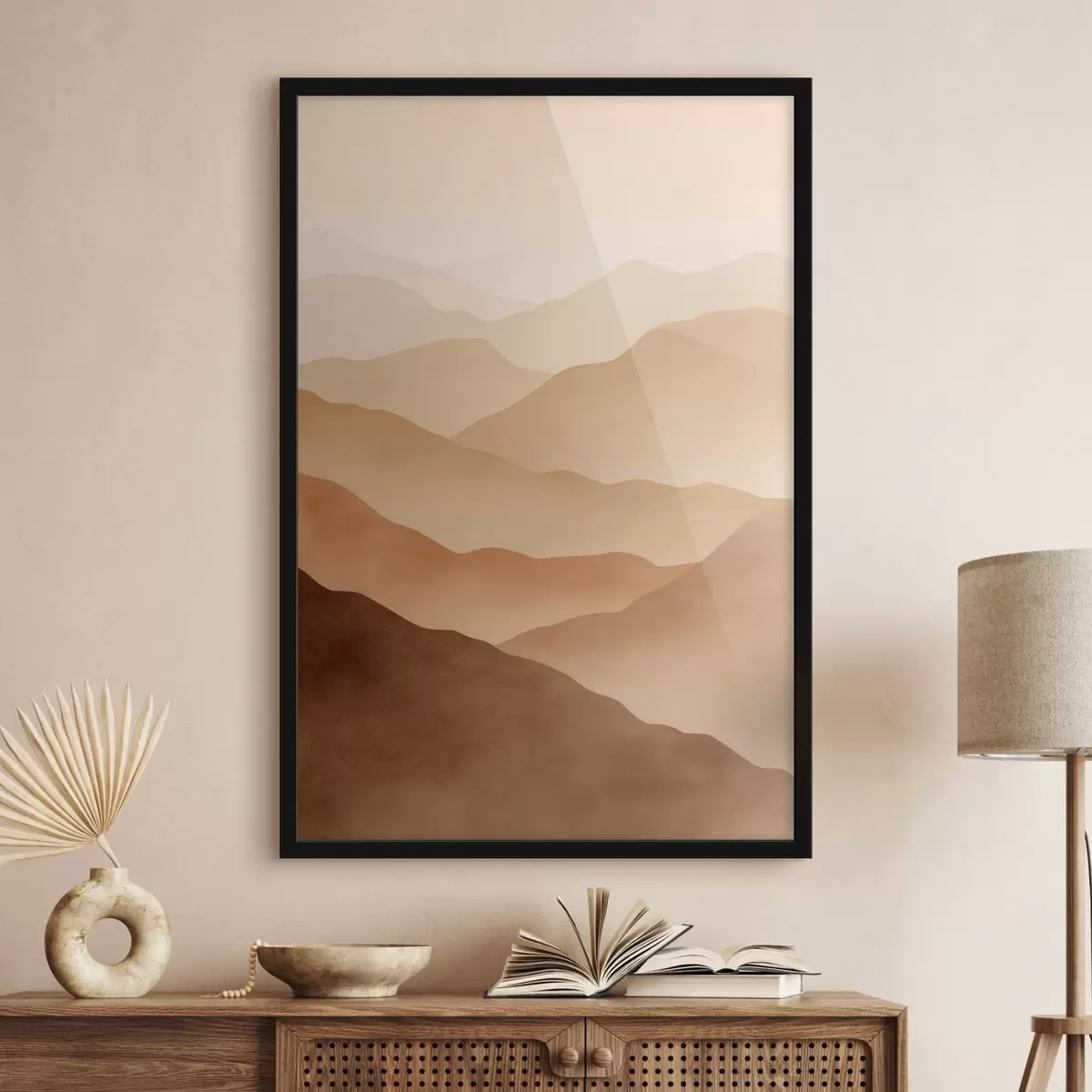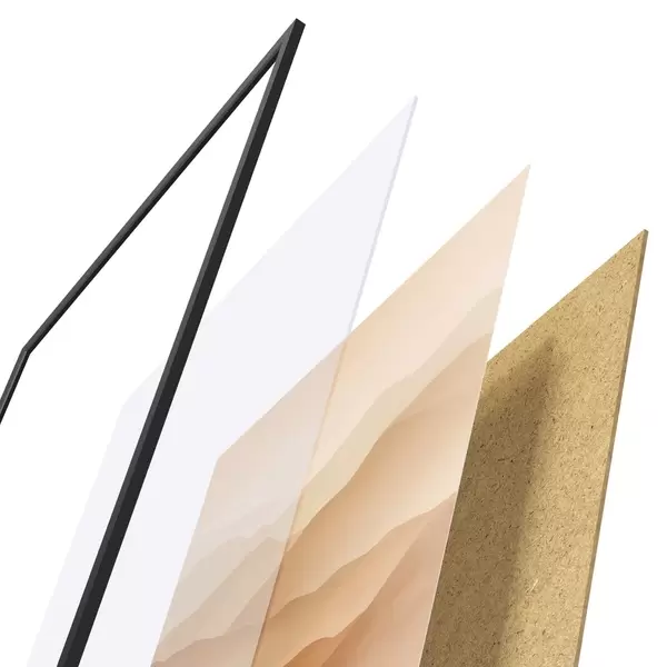 De poster bestaat uit een frame, plexiglas, geprinte afbeelding en spaanplaat achterkant. De poster kan meteen aan de muur worden gehangen dankzij de bevestigingen op de achterkant.