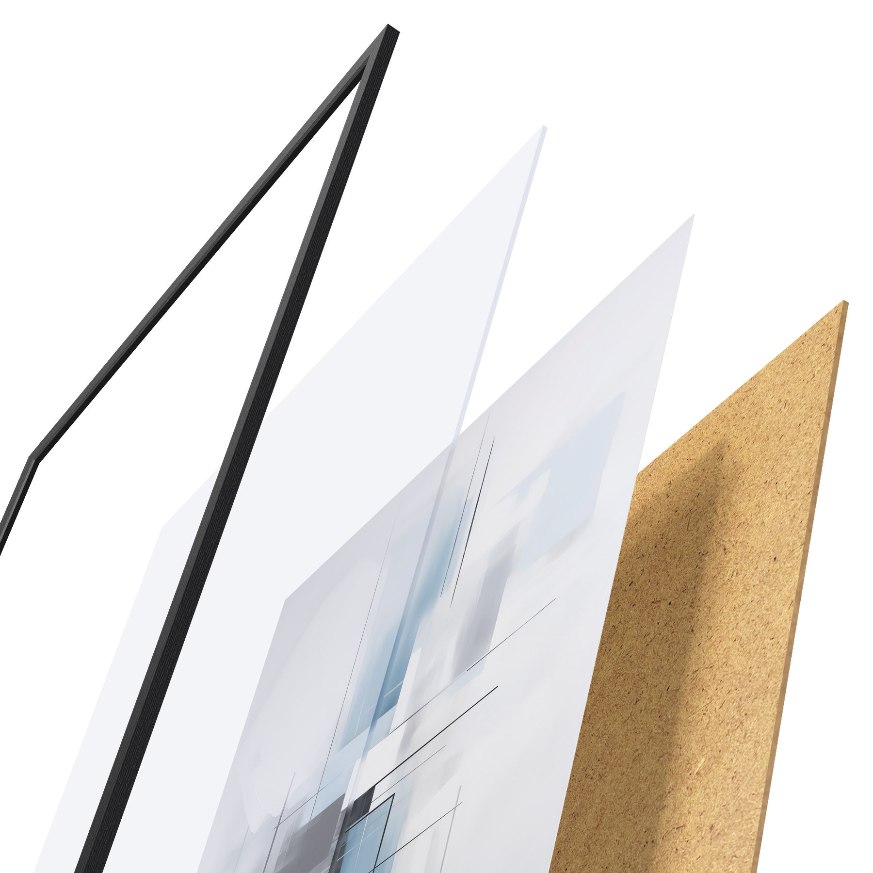 De poster bestaat uit een frame, plexiglas, geprinte afbeelding en spaanplaat achterkant. De poster kan meteen aan de muur worden gehangen dankzij de bevestigingen op de achterkant.