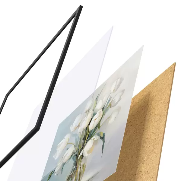 De poster bestaat uit een frame, plexiglas, geprinte afbeelding en spaanplaat achterkant. De poster kan meteen aan de muur worden gehangen dankzij de bevestigingen op de achterkant.