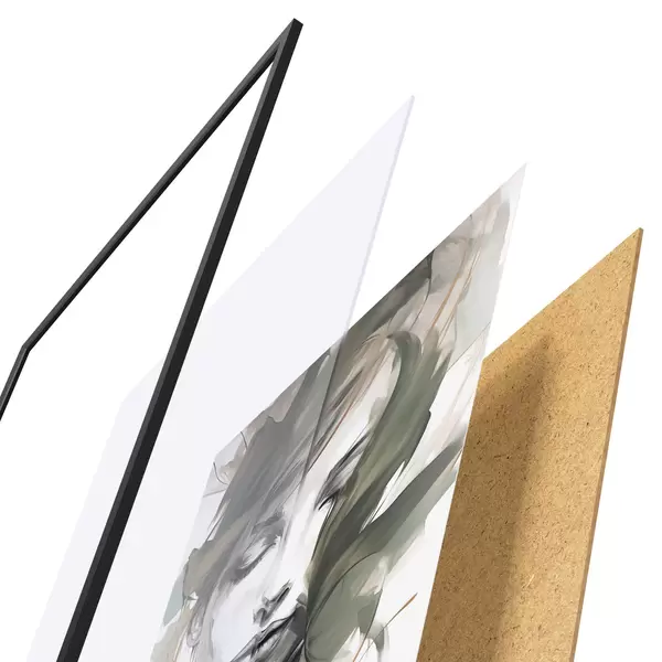 De poster bestaat uit een frame, plexiglas, geprinte afbeelding en spaanplaat achterkant. De poster kan meteen aan de muur worden gehangen dankzij de bevestigingen op de achterkant.