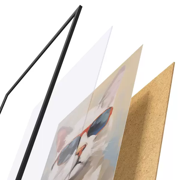 De poster bestaat uit een frame, plexiglas, geprinte afbeelding en spaanplaat achterkant. De poster kan meteen aan de muur worden gehangen dankzij de bevestigingen op de achterkant.