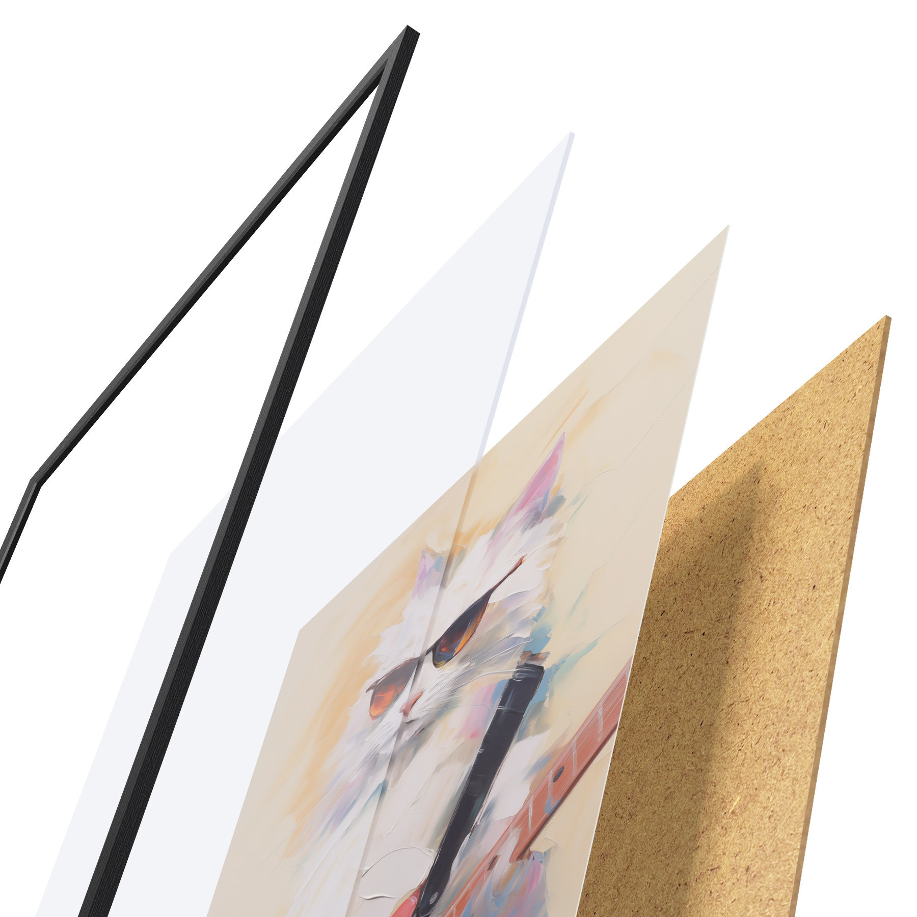 De poster bestaat uit een frame, plexiglas, geprinte afbeelding en spaanplaat achterkant. De poster kan meteen aan de muur worden gehangen dankzij de bevestigingen op de achterkant.