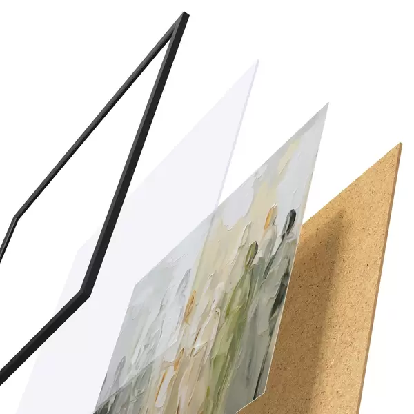 De poster bestaat uit een frame, plexiglas, geprinte afbeelding en spaanplaat achterkant. De poster kan meteen aan de muur worden gehangen dankzij de bevestigingen op de achterkant.
