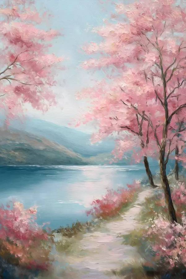 Poster landschap met roze bomen in olieverfstijl Nr f48289