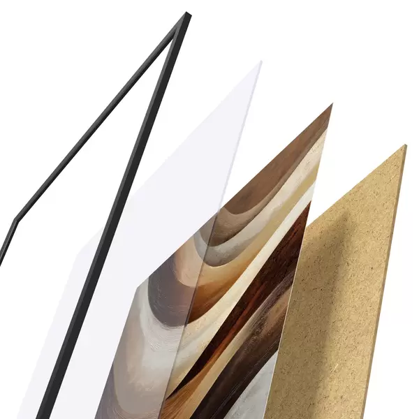 De poster bestaat uit een frame, plexiglas, geprinte afbeelding en spaanplaat achterkant. De poster kan meteen aan de muur worden gehangen dankzij de bevestigingen op de achterkant.