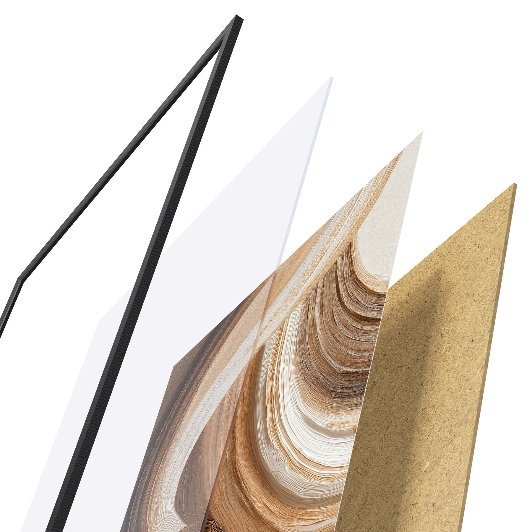 De poster bestaat uit een frame, plexiglas, geprinte afbeelding en spaanplaat achterkant. De poster kan meteen aan de muur worden gehangen dankzij de bevestigingen op de achterkant.