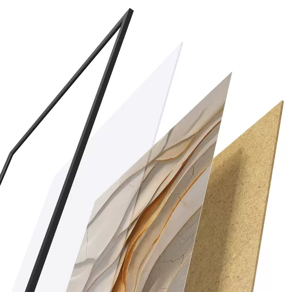 De poster bestaat uit een frame, plexiglas, geprinte afbeelding en spaanplaat achterkant. De poster kan meteen aan de muur worden gehangen dankzij de bevestigingen op de achterkant.