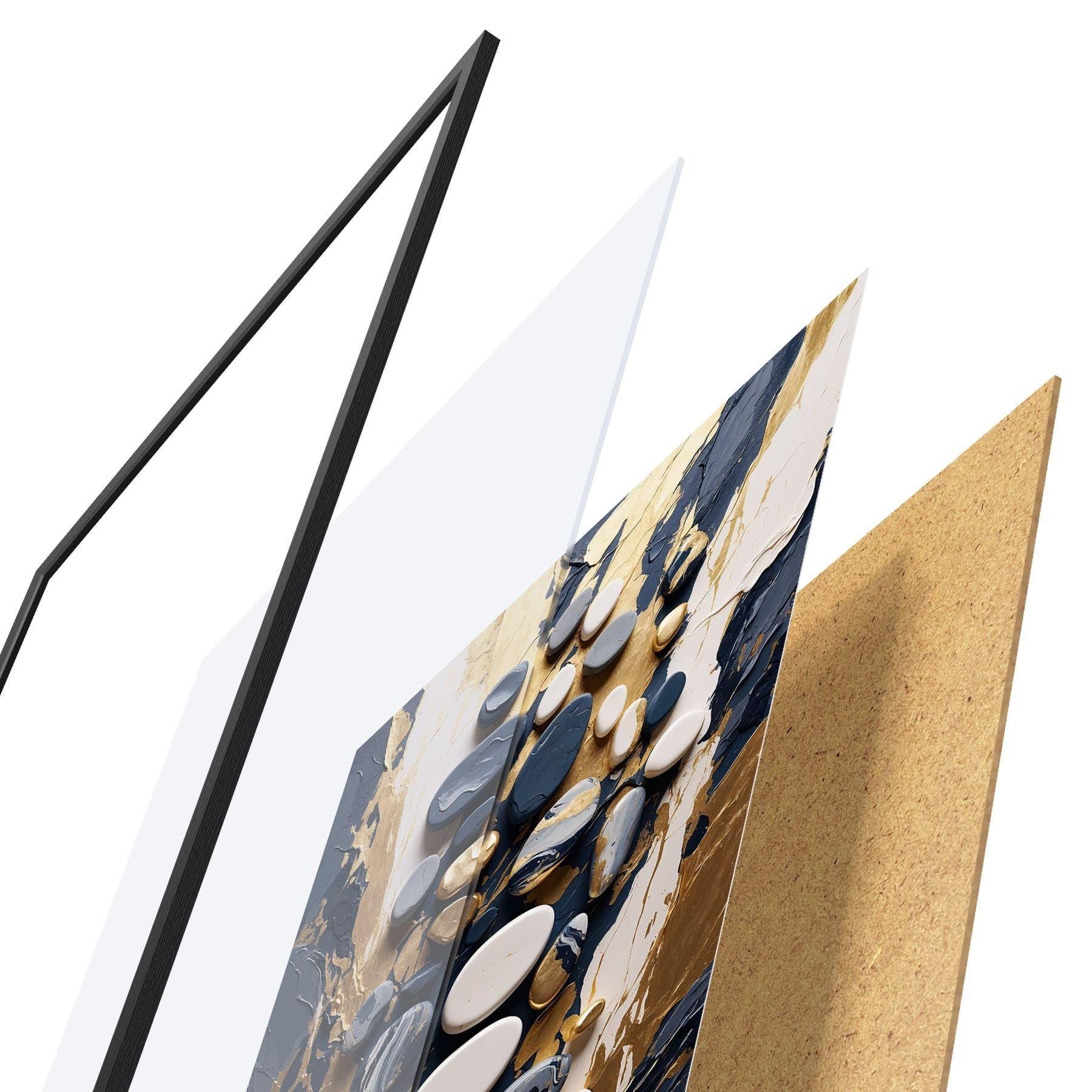 De poster bestaat uit een frame, plexiglas, geprinte afbeelding en spaanplaat achterkant. De poster kan meteen aan de muur worden gehangen dankzij de bevestigingen op de achterkant.