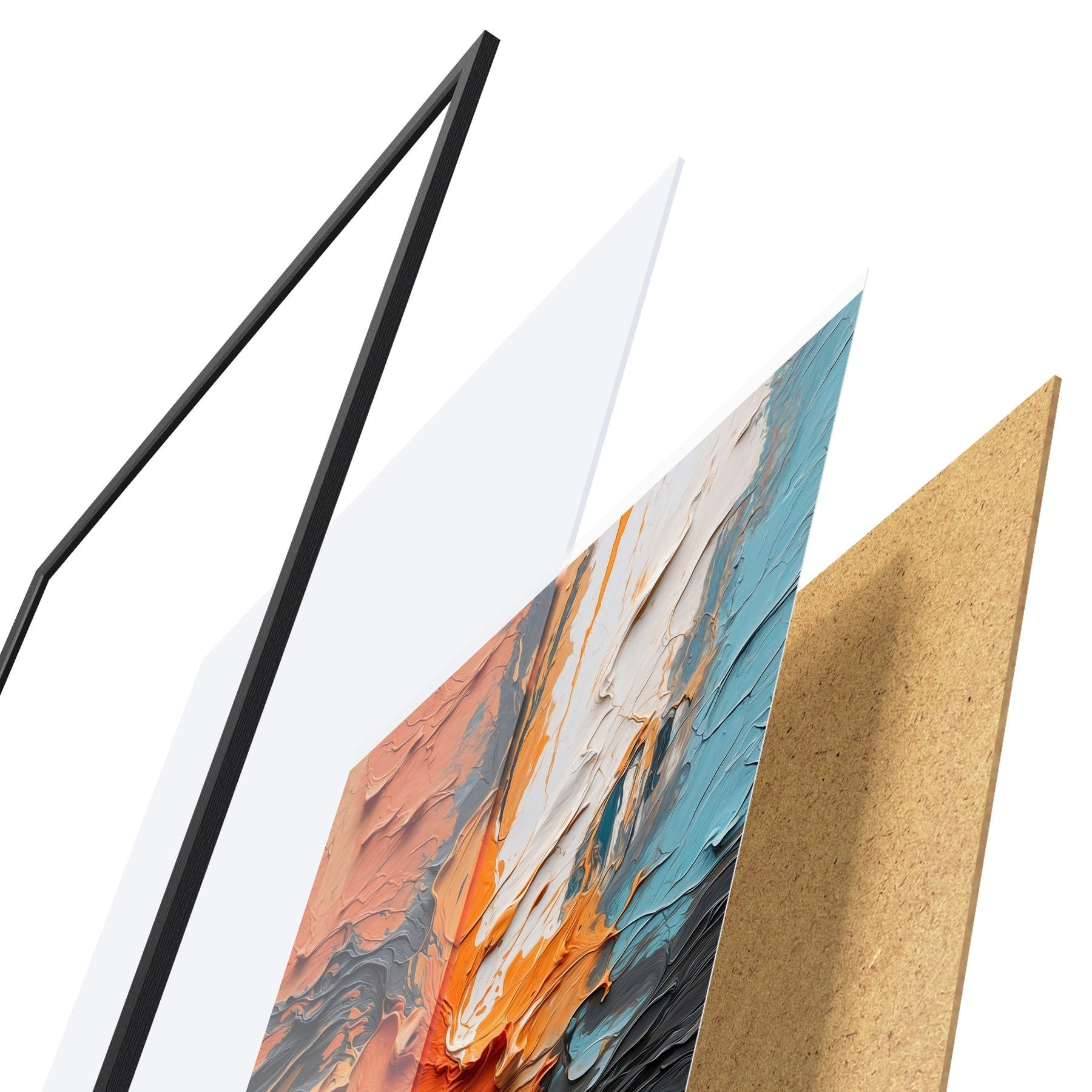 De poster bestaat uit een frame, plexiglas, geprinte afbeelding en spaanplaat achterkant. De poster kan meteen aan de muur worden gehangen dankzij de bevestigingen op de achterkant.