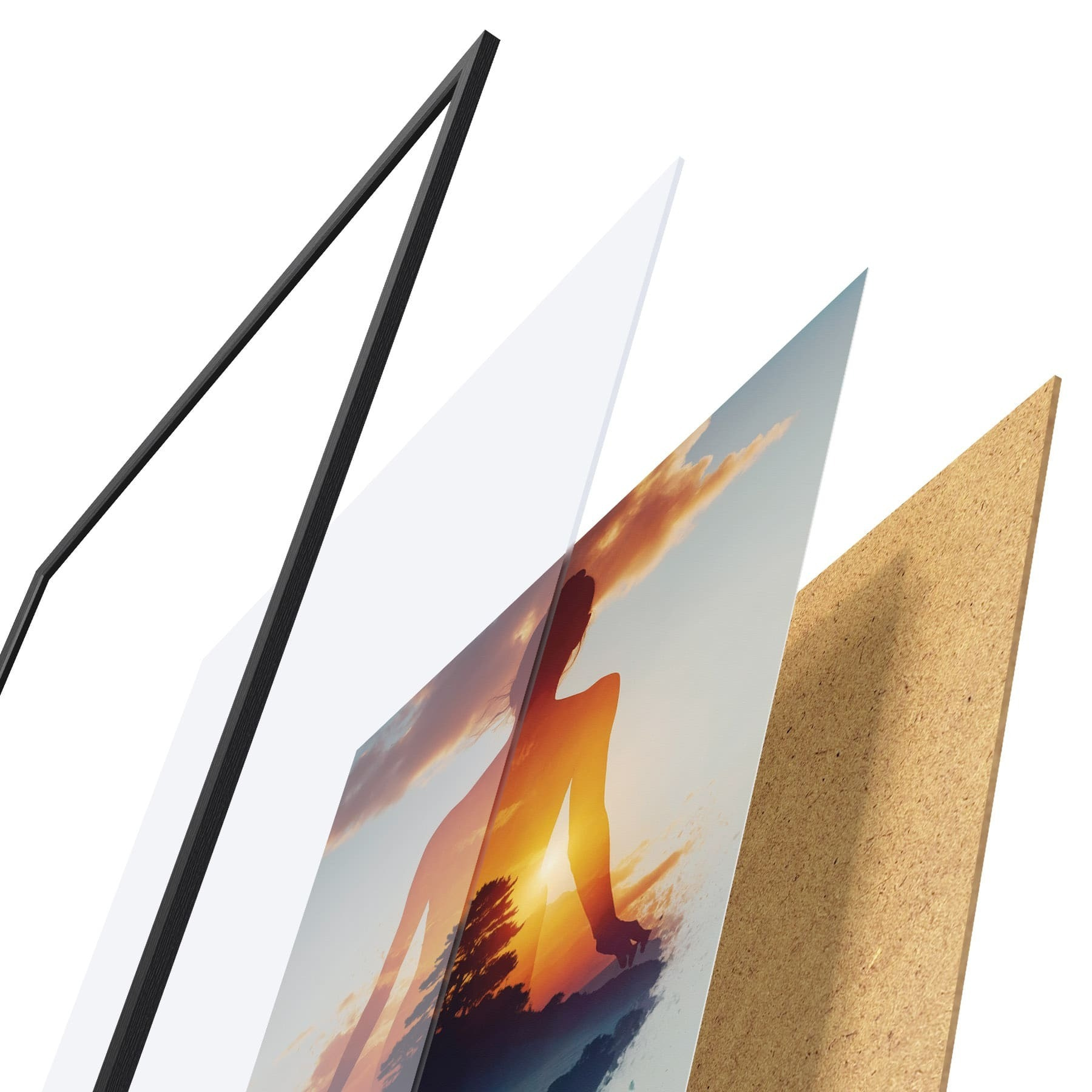 De poster bestaat uit een frame, plexiglas, geprinte afbeelding en spaanplaat achterkant. De poster kan meteen aan de muur worden gehangen dankzij de bevestigingen op de achterkant.