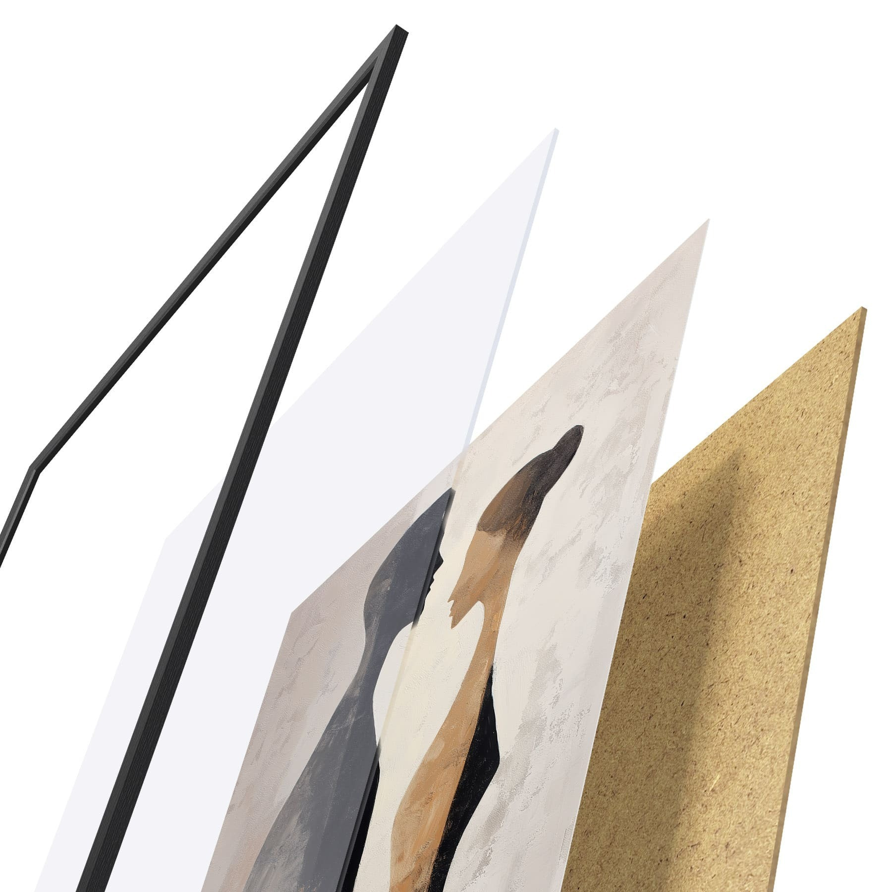 De poster bestaat uit een frame, plexiglas, geprinte afbeelding en spaanplaat achterkant. De poster kan meteen aan de muur worden gehangen dankzij de bevestigingen op de achterkant.