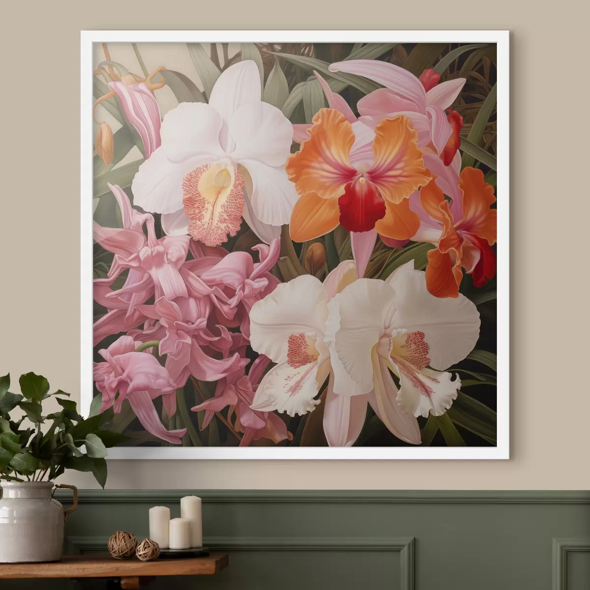 Poster Boeket met tropische bloemen, orchideeën met groen blad op de achtergrond Nr f48385