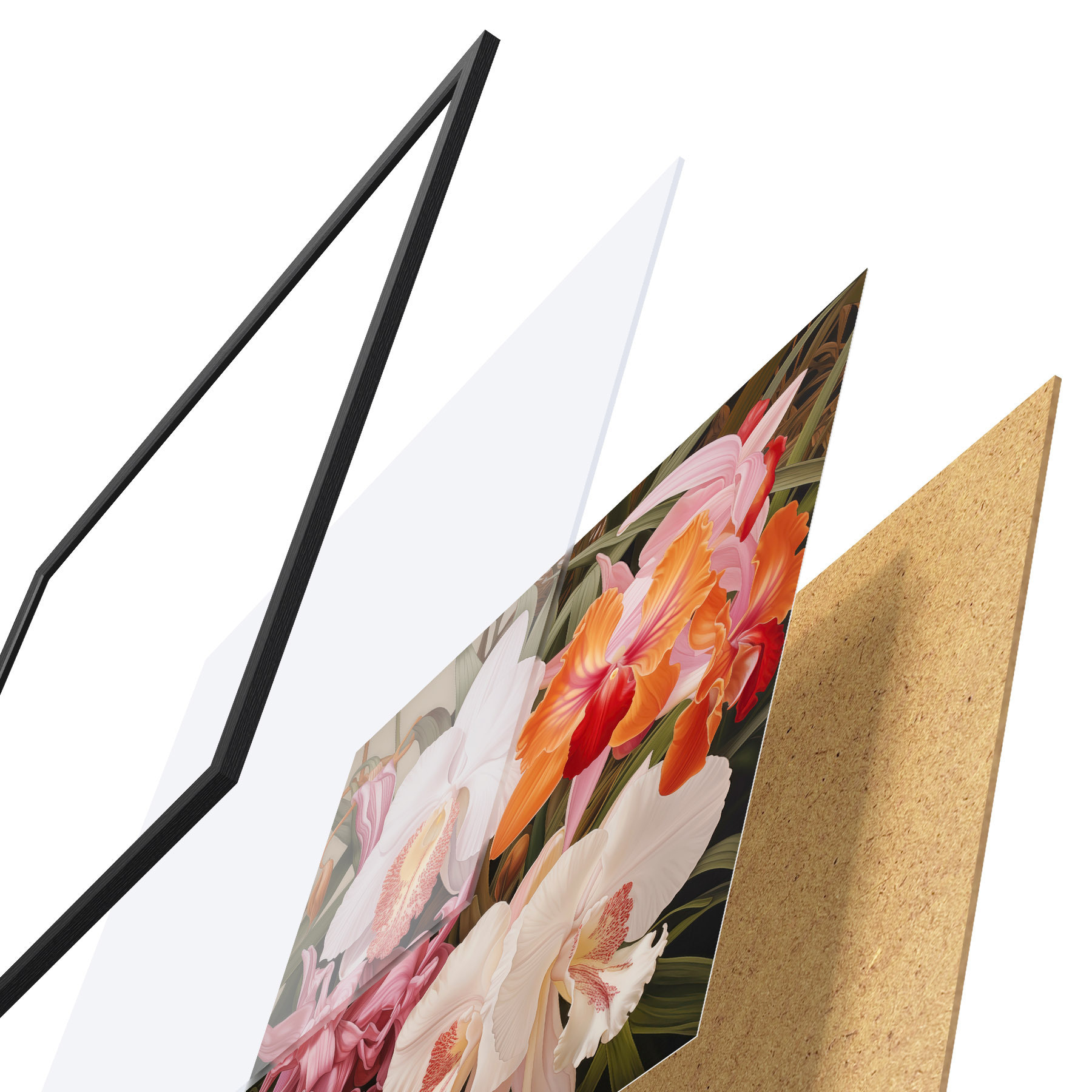 De poster bestaat uit een frame, plexiglas, geprinte afbeelding en spaanplaat achterkant. De poster kan meteen aan de muur worden gehangen dankzij de bevestigingen op de achterkant.