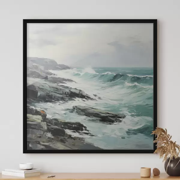 Poster Een rotsachtig kustlandschap met golven onder een bewolkte hemel, in schilderijstijl Nr f48387