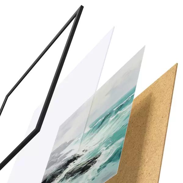 De poster bestaat uit een frame, plexiglas, geprinte afbeelding en spaanplaat achterkant. De poster kan meteen aan de muur worden gehangen dankzij de bevestigingen op de achterkant.