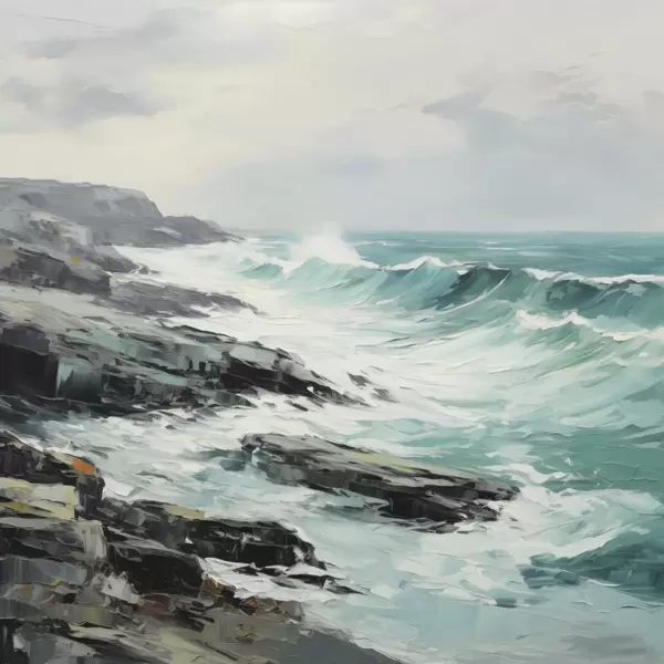 Poster Een rotsachtig kustlandschap met golven onder een bewolkte hemel, in schilderijstijl f48387