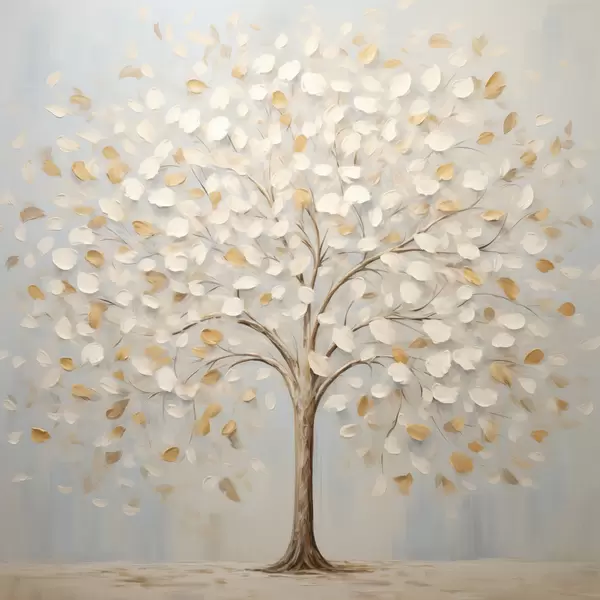 Poster Een schilderij met textuur van een boom met witte en gele bladeren tegen een lichtblauwe achtergrond Nr f48391