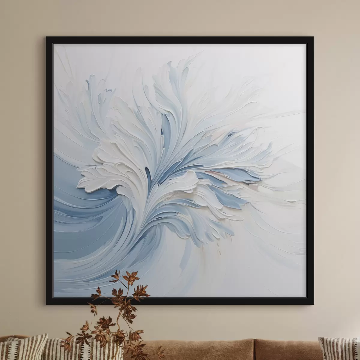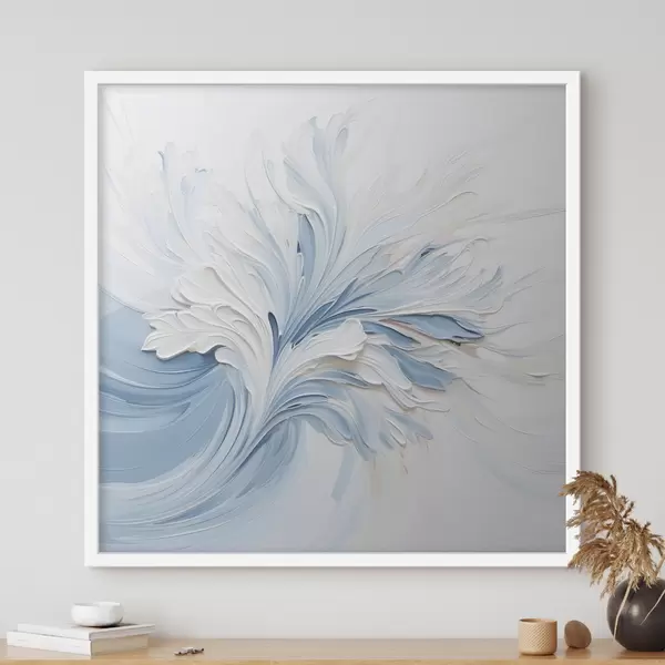Poster Een abstract bloemmotief in wit en lichtblauw met bloemblaadjes met textuur en wervelende lijnen Nr f48395